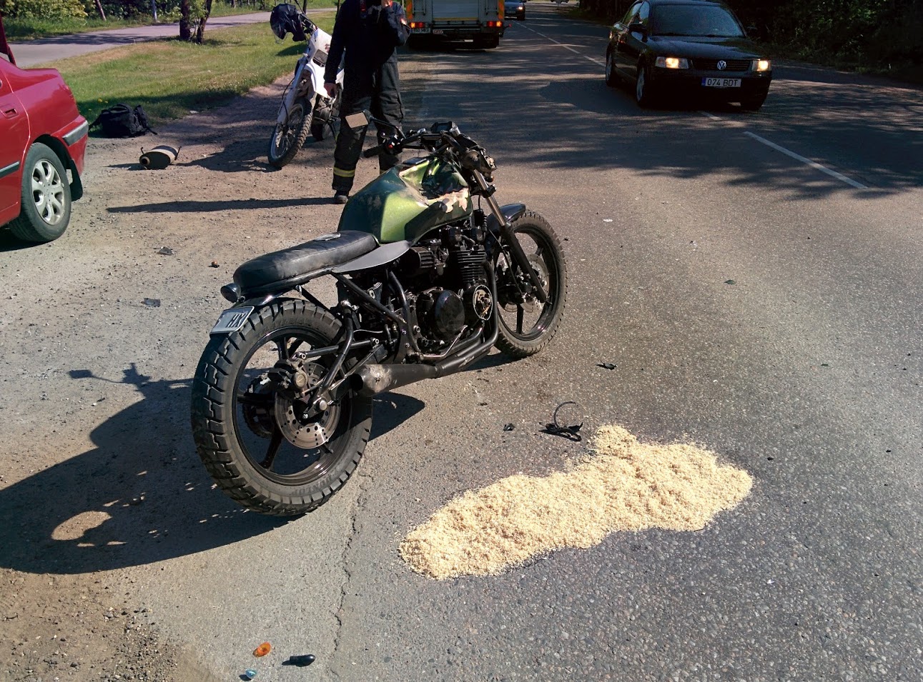 Rattaga kurvasti, sabaraam ja lenks kõverad, esituli ja taga suunatuled katki, magneetokaas + magneeto rootor purud, paak ja sumps täiesti kortsus. Noh pilt seletab.. Ise sain korraliku õhulennu ja hetkeks pilt taskusse kah, õnneks pääsesin kergema peapõrutuse, muljutud ribide, ära tõmmatud õla ning hunniku pisemate muhkudega, õnneks oli korralik varustus seljas.