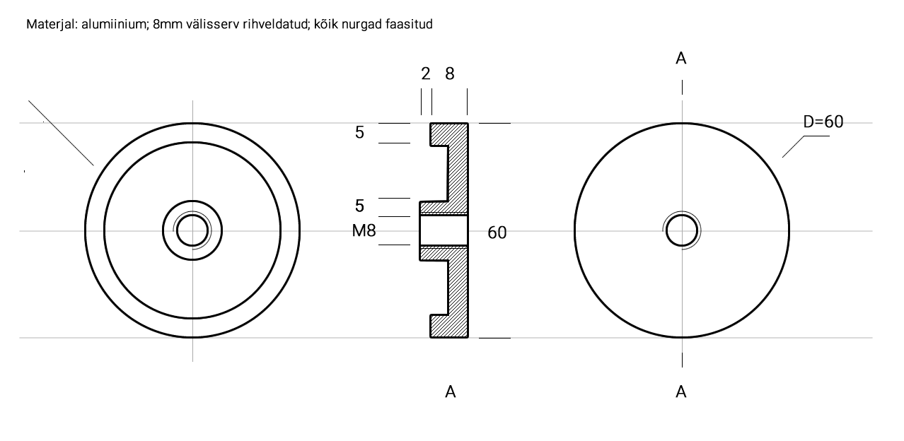 Mul on vaja nelja alumiinumist ketast, diameeter 60 mm, paksus 11mm, keskel keermestatud auk (M8) ja serv rihveldatud.