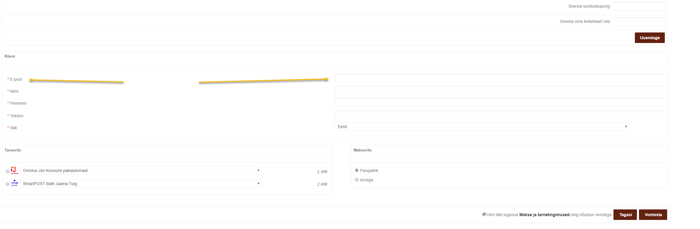 daub kirjutas:Miks, on raske öelda, aga minul ei toimi. Kirjutab igasugust kohustuslike lahtrite juttu, aga täitmiseks välju ei ole. Kui ma tahaksin pakiautomaati saada, siis peaksin ikka saama telefoni nr või maili lisada, et pakiautomaadi koodid kuidagi saada.