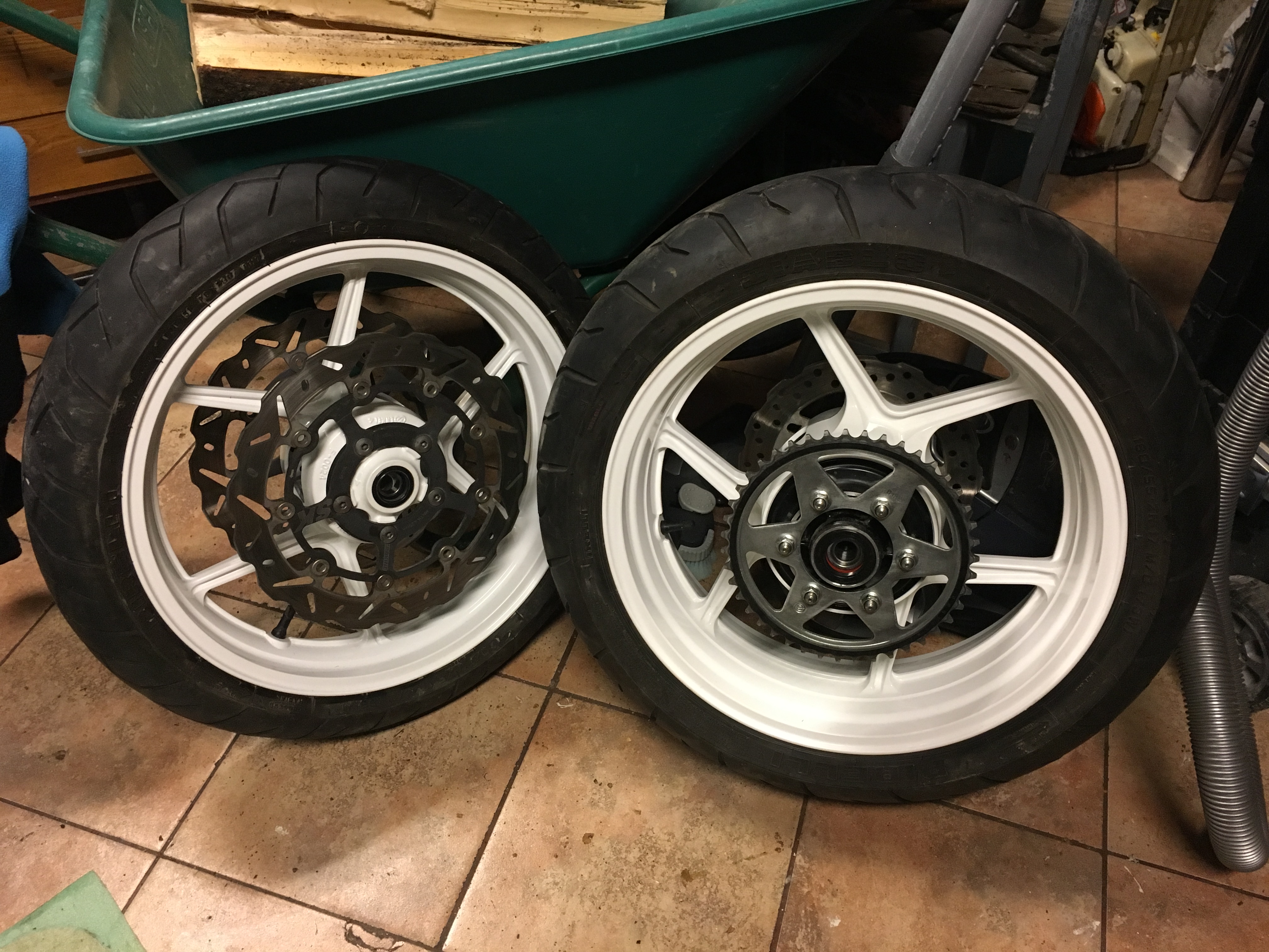 Vahepeal siis nii palju, et veljed värvitud, bellypan ostetud, mustad detailid paigaldatud, uus aku ja rattaga ka esimene tiir tehtud. Ladusin ta peaaegu täitsa kokku, puudu on siis hetkel esiporikas kuna läks koos bellypaniga maalri kätte. Unustasin pilti teha kui ta täitsa kokku sai aga mõned sai siiski vahepeal tehtud. Päeva lõpuks avastasi kahjuks, et tagurehv tühjaks läinud aga homme viskan sellele pilgu peale.