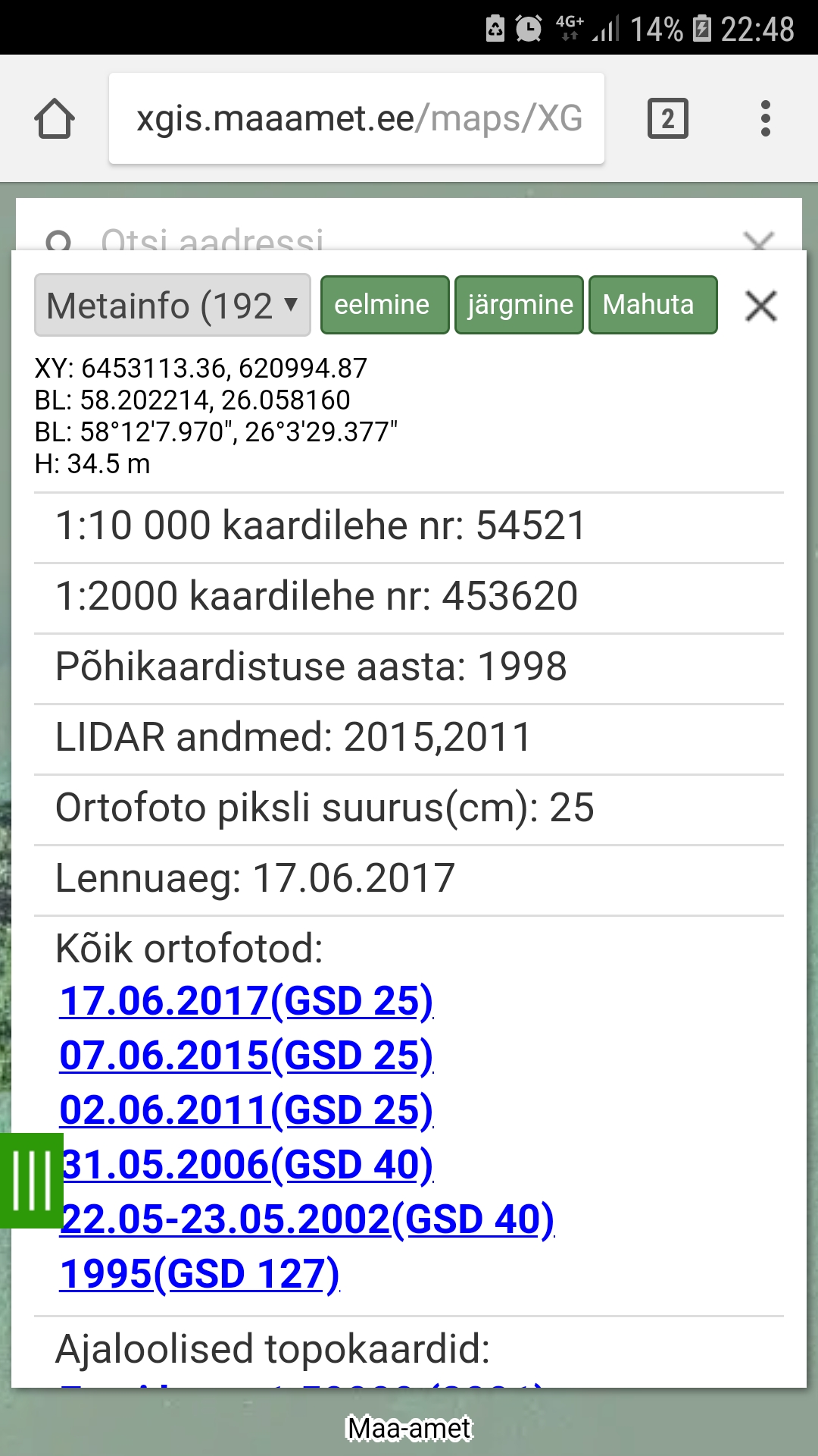 Võtad sobiva ortofoto ette ja klõpsad kaardil, avanenud dialoogis näitab kuupäeva.