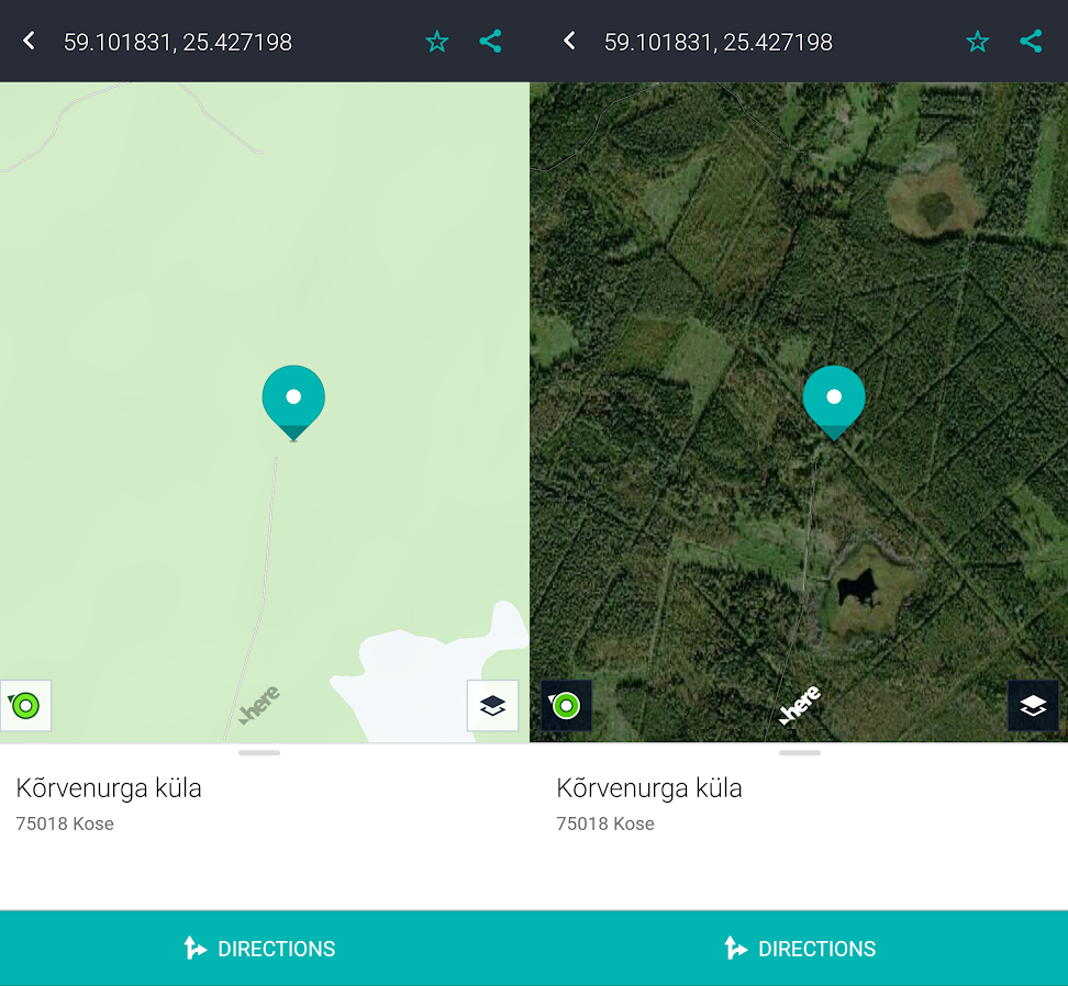 Regio Eesti teed. Regio äpp ei toeta koordinaatide järgi otsimist. Otsisin lähima küla järgi asukoha kaardilt ning kaardil iseenesest esimesse punkti viiv tee on olemas. Vasakul pildil Regio tava kaart ning paremal hübriid ehk tava + ortifoto.