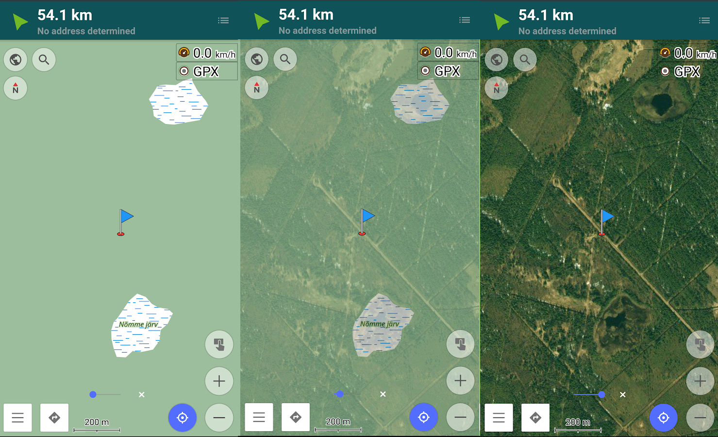 Pildid vasakult paremale: OsmAnd offline vektor kaart -> vektor kaart + Microsoft Earth pool läbipaistvana -> vektor kaart + Microsoft Earth täielikult katmas vektor kaarti.