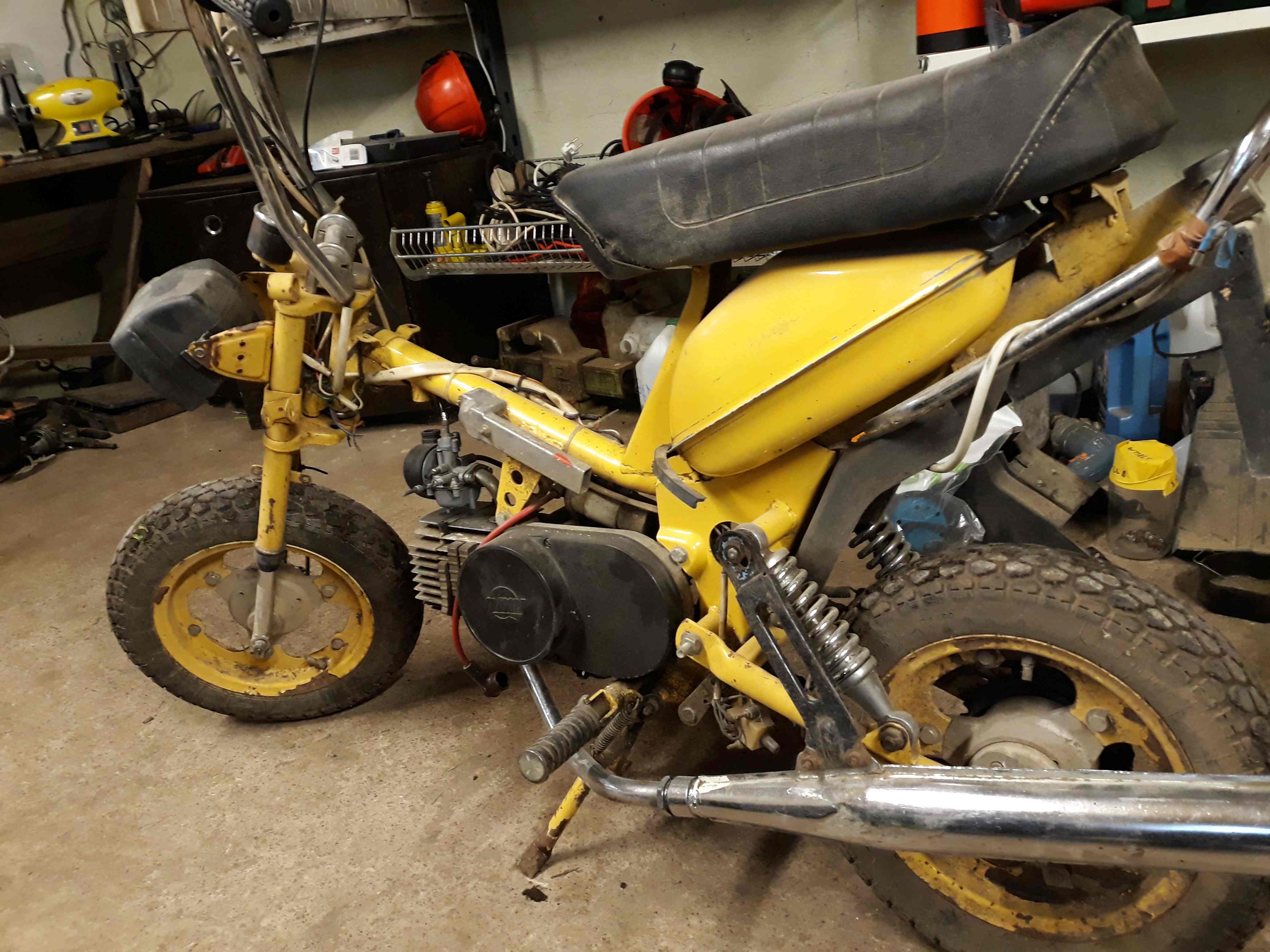Stella on suhtelisel komplektne- esitule klaas puudu (kellegi tütar oli tollega võsas käinud ja ära lõhkunud), piduripedaal ja spidotross. Plastikud natuke räsitud kuid mootor käib ringi ja isegi turtsatas korraks käima. Raam on sirge, rehvid peavad õhku ja esmapilgul tundub hea saak.