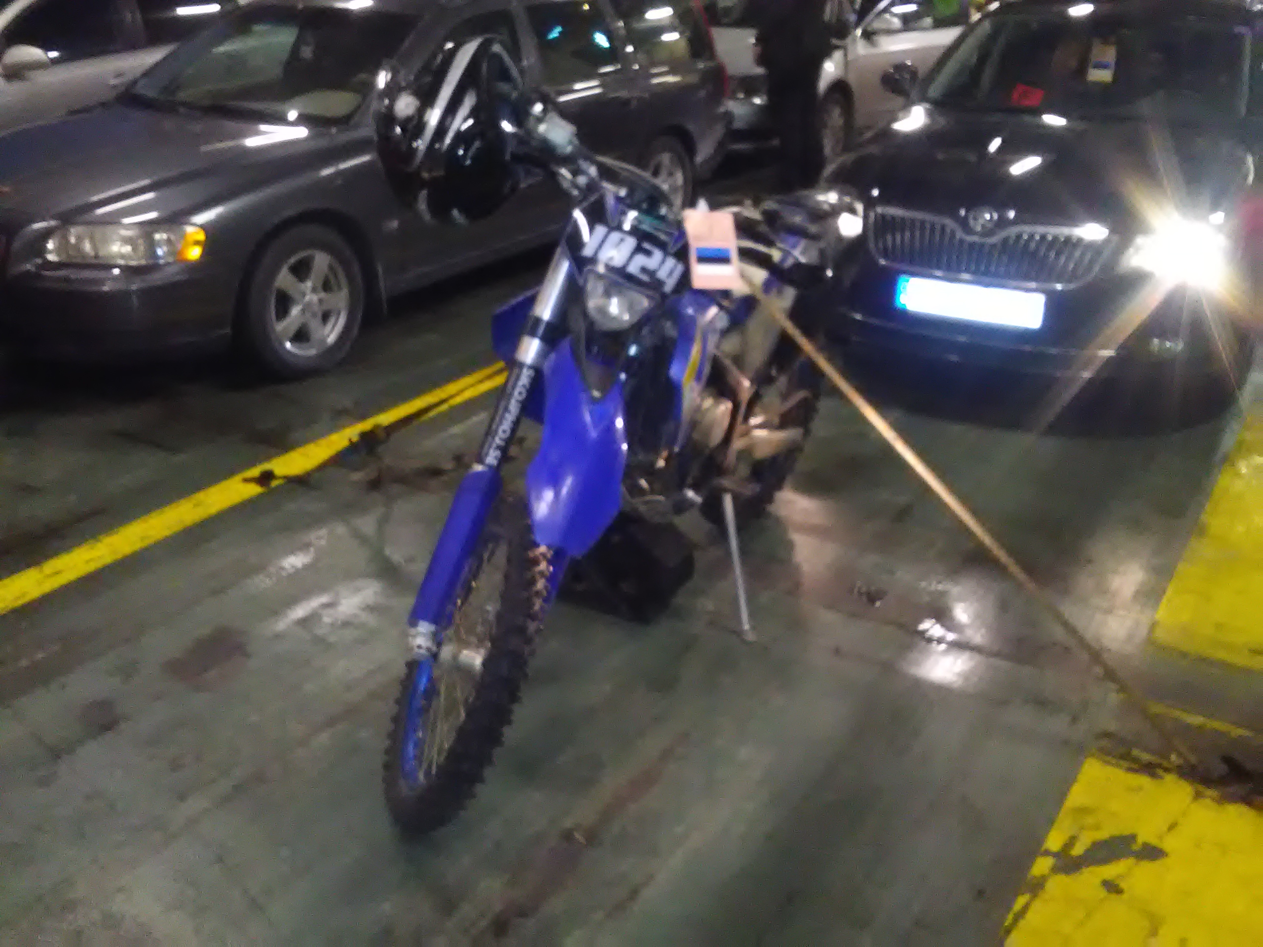 Muidu kui väljamaalt toomisest ja viitsimisest üldisemalt rääkida, siis mul on sellesama ülalmainitud Husabergi najal selline lahe näide tuua: eelmine aasta oktoobris oli siis firma ürituseks kruiis Stocki...ning peale linnaekskursiooni, kui enamus laeva tagasi magama (või sinna edasi jooma...) läks, ei viitsinud ma jälle niisama töllerdada ja võtsingi paar pisut ennem ääri-veeri uuritud ratast ette. Ise tahtsin küll enim Fe390 osta, et vähe rahulikum üleminek oleks, aga kuna selline oli ikkagi just müüdud, jäi sõelale siis Fe450. Omanik oli esialgu hinnaks küll 25k Sek maininud, kuid peale klapikamprikaane ülanurgast õlilekke leidmist ja veel mingi katkise plasti vms "iluvea" peale nägude tegemist jäi lõpuks 21oooSek, ehk tolle aja kursi järgi u. 2150€ hinnaks. Päris 20k eest siis ei saanud, aga vähemalt viis mind veel rattaga kenasti sadamasse, kus tuli vaid paarkümmend €uri veel pileti eest loovutada ja nii ta Eesti tuligi!