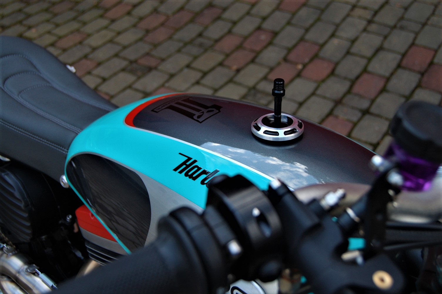 Värvilahendus oli kliendi soov aga tore, et selliseid julgeid mehi on, sest halle ja musti rattaid on piisavalt palju tehtud. Lenksulülitid on ise aretatud Motogadgeti koopiatest ja oomipoe pushbuttonitest. Esikondel ja saba on Motoforzast mis on kah ringi tehtud.