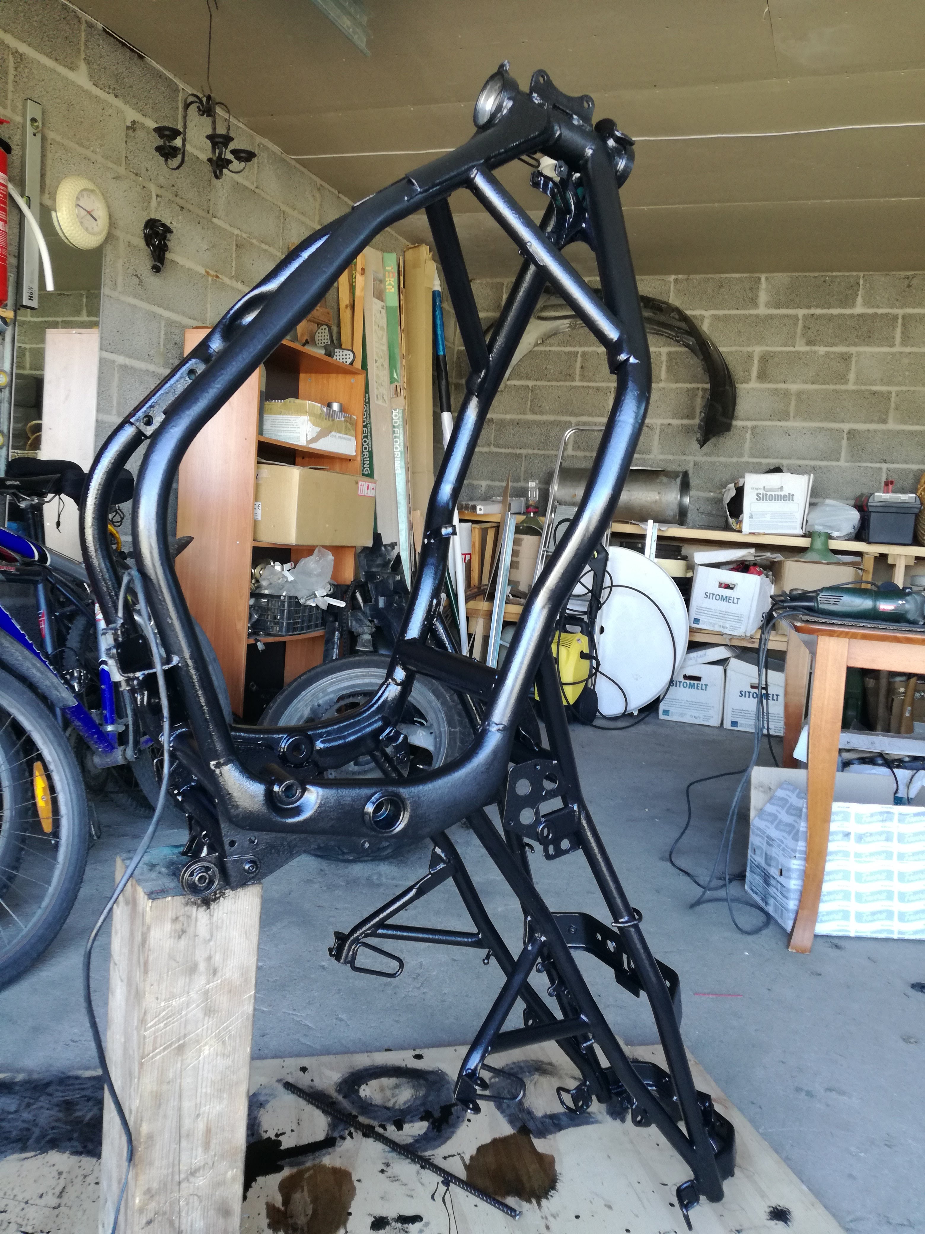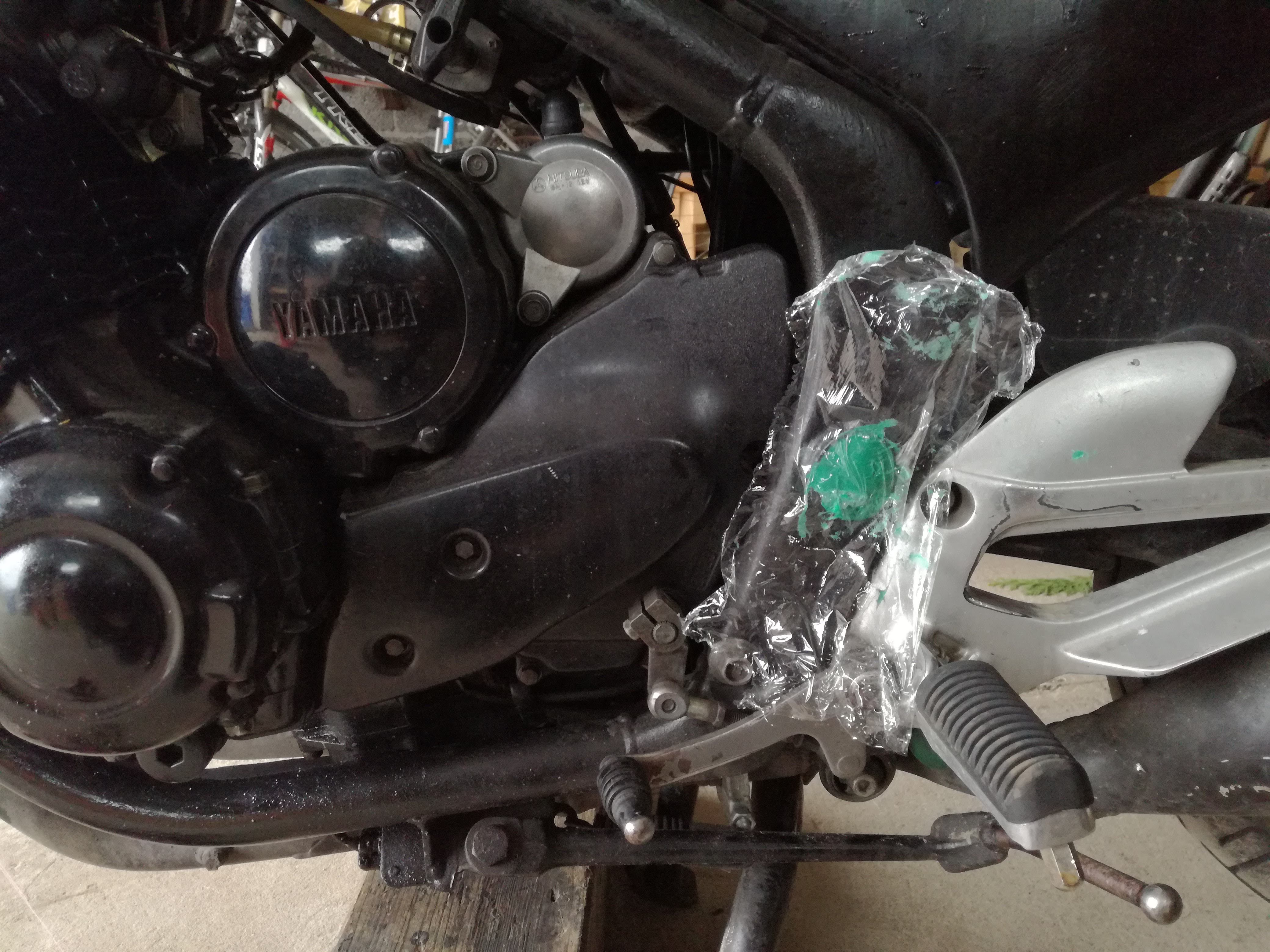 Ehk siis käiguvaheti trumli kinnitus oli pooleks ja kahvel retsi saanud. Käigukastil endal viga ei tundunud olevat. Peale kahvli kriipimisjälgede. Nüüd roostest puhtaks ja värvi alla. Kuna tegemist vana ja odava tsikliga, siis ma ei näe vajadust meeletut raha sinna matta. Värvid - sprei ja spido - hiina. Uued kahvlid ka kohal.