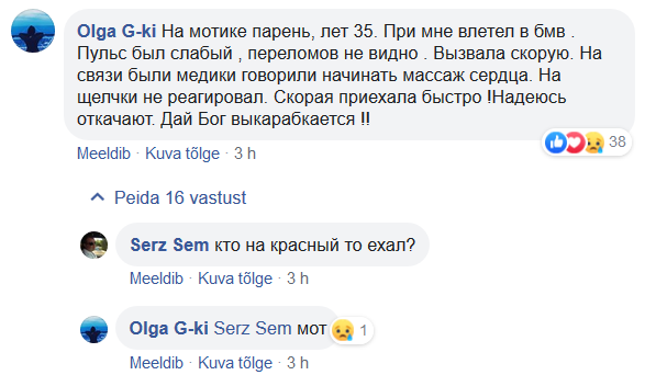 Ma saan siit loetud fb dialoogist aru, et O ei olnud bemmi roolis vaid nägi pealt ja kutsus abi. Pri mne vletel v bmv = minu nähes lendas bemmile sisse. Bemmi juht oleks kirjutanud teistmoodi, emotsionaalsemalt. Ja ta ei tohiks näha, milline foorituli põleb küljelt liginevale tsiklile.