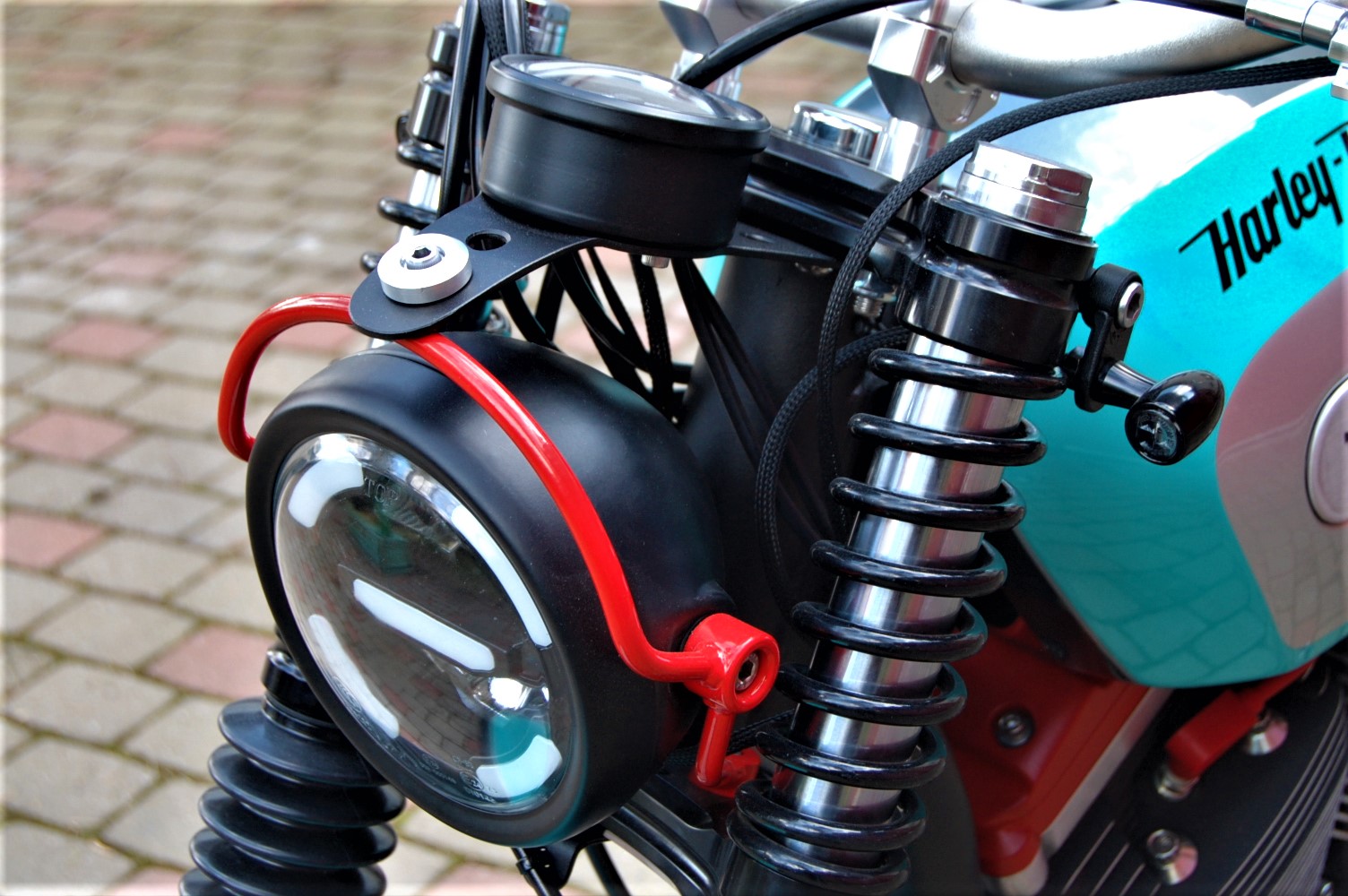 Värvilahendus oli kliendi soov aga tore, et selliseid julgeid mehi on, sest halle ja musti rattaid on piisavalt palju tehtud. Lenksulülitid on ise aretatud Motogadgeti koopiatest ja oomipoe pushbuttonitest. Esikondel ja saba on Motoforzast mis on kah ringi tehtud.
