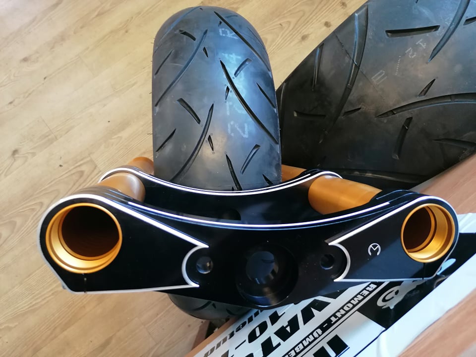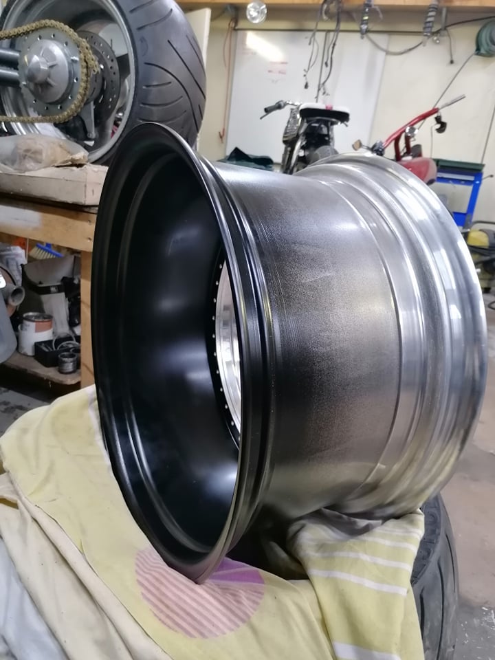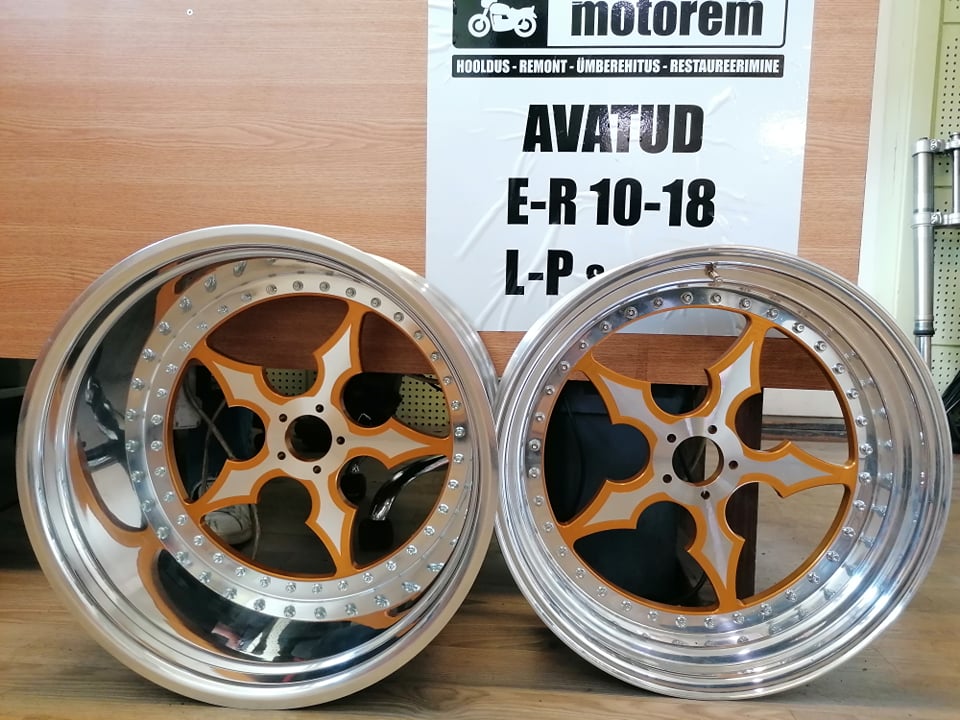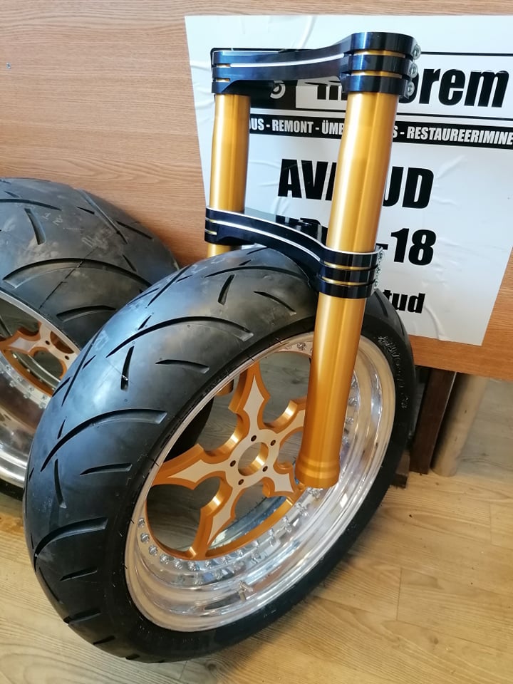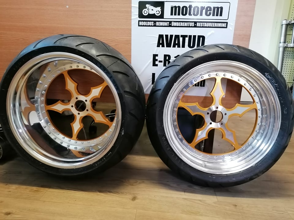 Veljed sain siis eile kätte. Kõik uued kettad, laagrid, simmerid, rehvid ja muidugi veljed käisid sirgestuses ja värvimises. Värviks tuli metallik-kuldne