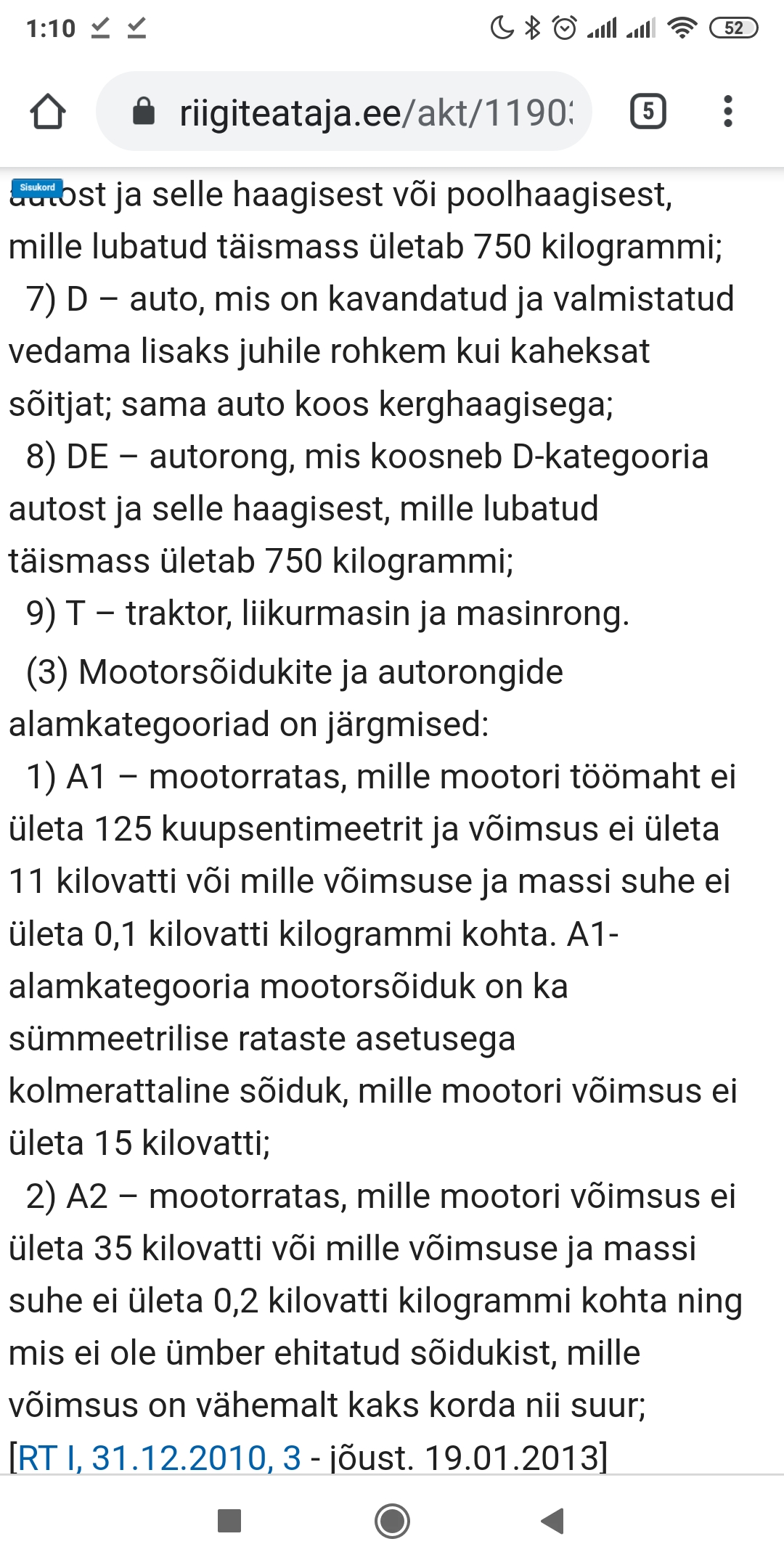 Mina loeks seadust nii: 2) A2 – mootorratas, mille mootori võimsus ei ületa 35 kilovatti (või mille võimsuse ja massi suhe ei ületa 0,2 kilovatti kilogrammi kohta) ning mis ei ole ümber ehitatud sõidukist, mille võimsus on vähemalt kaks korda nii suur;