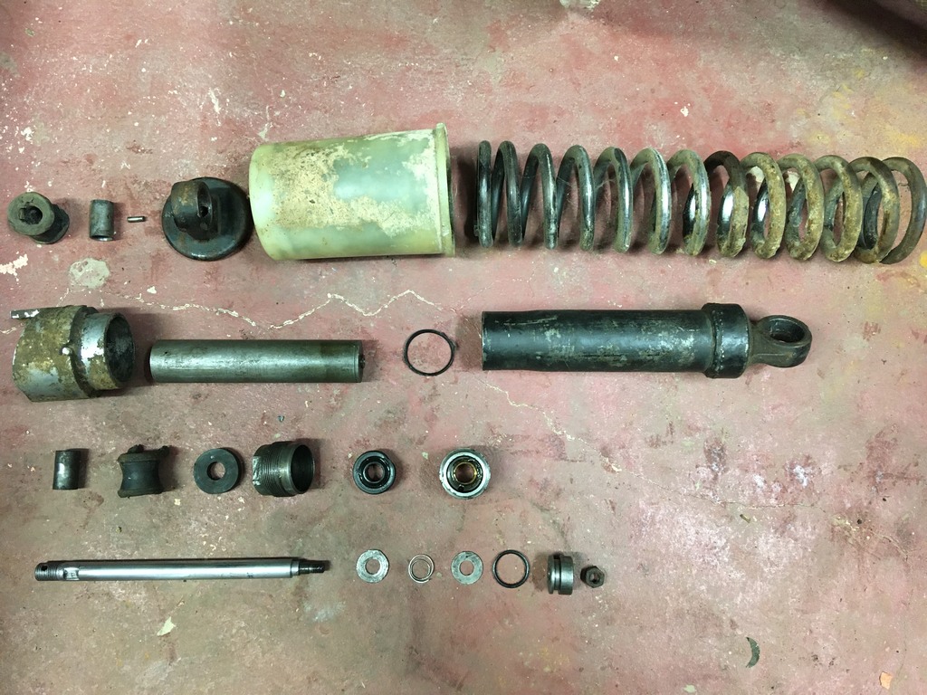 Võtsin kõik amordid alt ära. Vaataks kuidas seest välja näevad ja paneks uue õli sisse, eks näeb kas ja kui kauaks sisse jääb. Vana õli liiga vähe alles ja väga must. Ega õigeid uusi osasid kusagilt võtta pole. Vaatasin, et simmeri võibolla saaks isegi asendada praegu müüdava nö. tavalise simmeriga (originaal on natuke erilisema kujuga) kui sobiva mõõduga võtta on. Kolvi peal tundus olema kandilise profiiliga, aga äkki ümar sobiks ka panna (kardan, et kandilist pole võtta)? Kas kinnituse aukudesse käivaid kummipukse on võtta kusagilt?