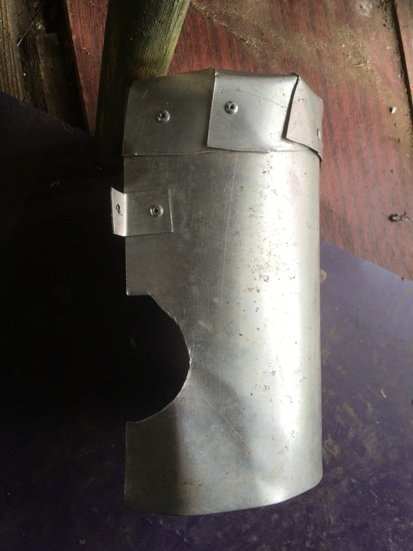 Võibolla tundub olema liiga kinnine ja silindri lähedal, aga ribidest on ikka mitu cm eemal. Võibolla peaks seda siiski veel muutma, et eest vasakut nurka rohkem avatuks tegema ja samas pikemalt allapoole suunama (teine plekk külge neetida), et ei hakkaks aku poole kuuma puhuma kui seda poolt rohkem avada. Küünla pealt puhub ka hoolega õhku ülespoole, võibolla ei peaks küünla ümber see ava nii suur olema, piisaks kui küünlavõti läbi mahub.