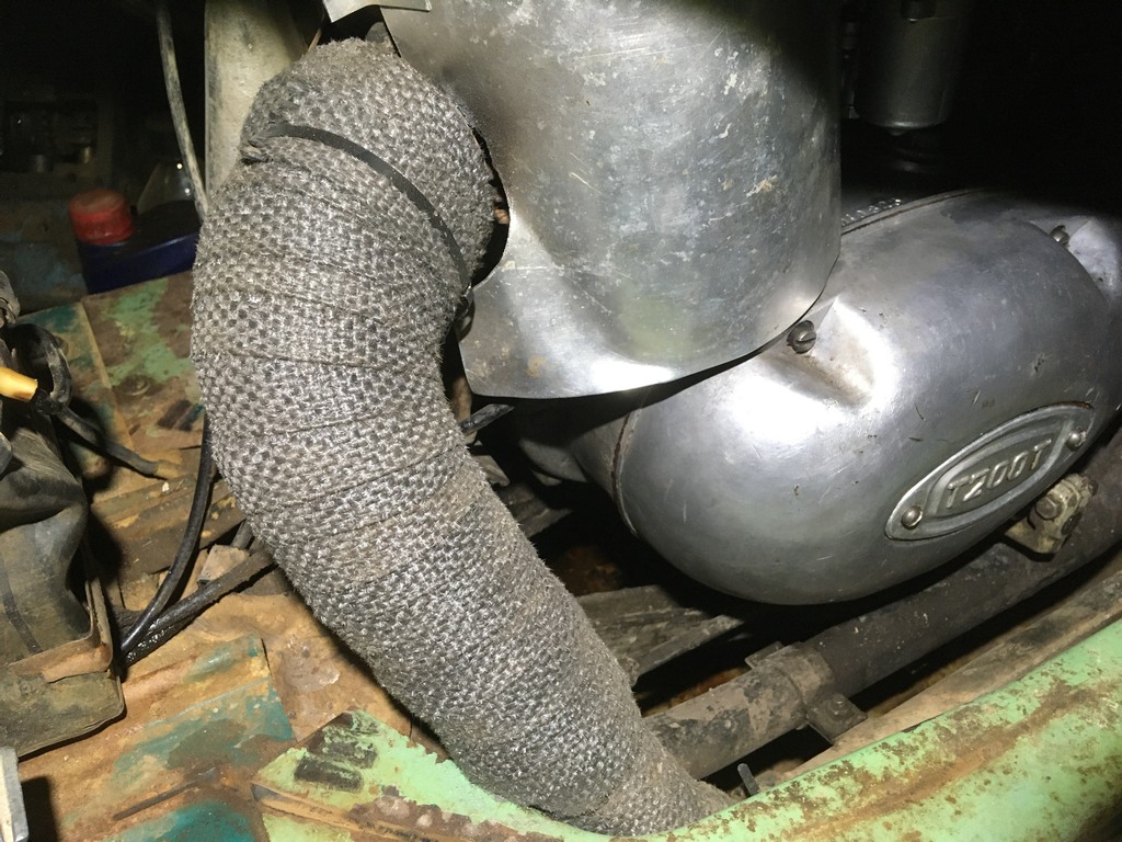 Silindripea on õigesti peal. See pilt on tehtud esimesel käivitamise päeval, praegu näeb mootor puhtam välja. Mõtlesin ka, et võiks proovida ise mingi katte sinna aretada, et puhuks suurema osa kuuma õhku põhja alla, praegu jääb päris palju istme alla, väljast plekk läheb vasakult poolt korralikult kuumaks. Istme all olevas tööriistade panipaigas oli mul sõites muuhulgas varuküünal kaasas ja see tundus peaaegu sama kuum olema nagu oleks äsja mootori küljes olnud, vähemalt käes hoida ei saanud.