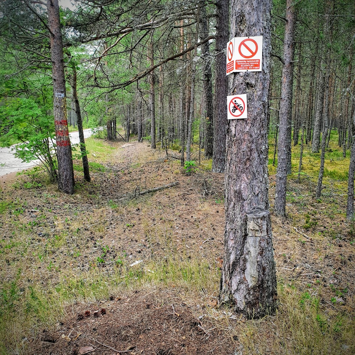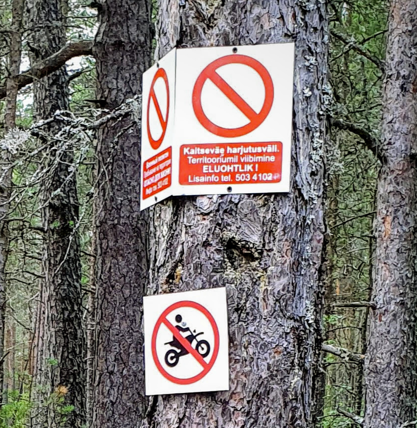 Piisavalt on maastiku läbivusega mootorsõidukitega metsa all püütud täiendavaid teid rajada... eks selleks ka lisa infotahvleid (mitte liiklusmärke) sätitud. Kuigi need mis pildil seal väga kaua vastu ei pea (kinnitatud ju lühikeste kruvidega männi koore külge).