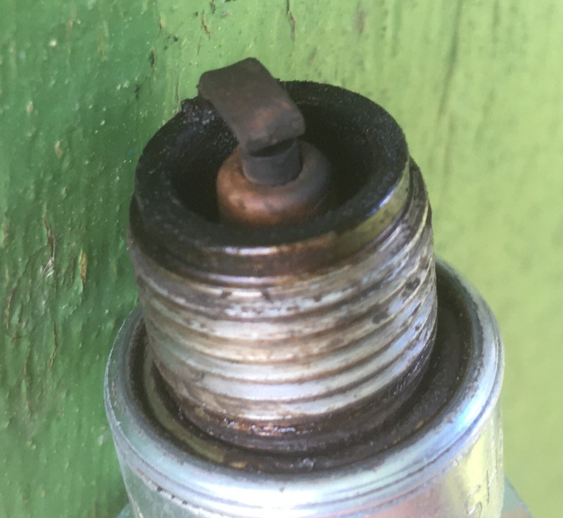 Nüüd vaatasin kuidas küünal välja näeb peale seda eelmist u. 125 km sõitu rikkama ja õlisema (1:18) seguga. Elektroodid ja isolaator täitsa head (?), neid ümbritseval metallosal on tahma näha.