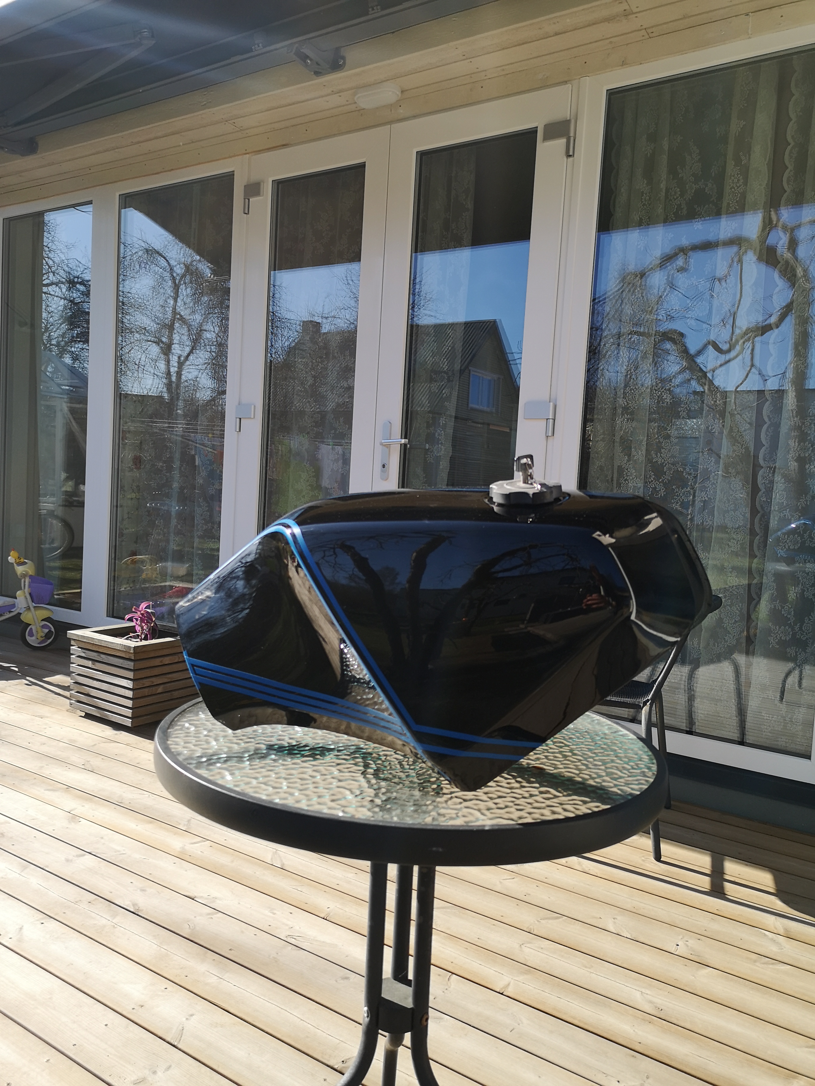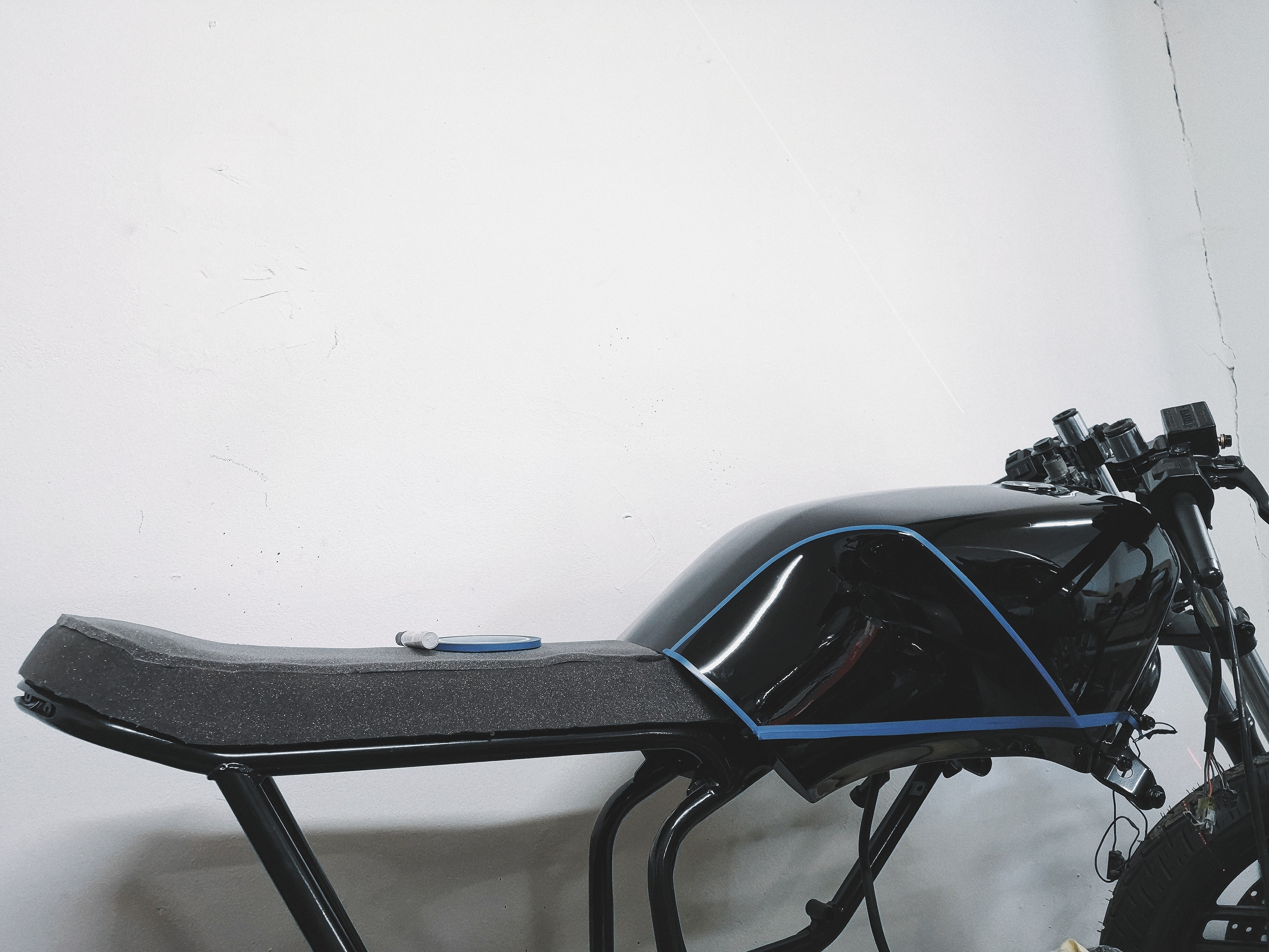 Et natukene visuaalset caferaceri joont tekitada, siis tagaraamiga samale joonele (justkui tagaraami pikenduseks paagile) tahan teha mattmusta joont.