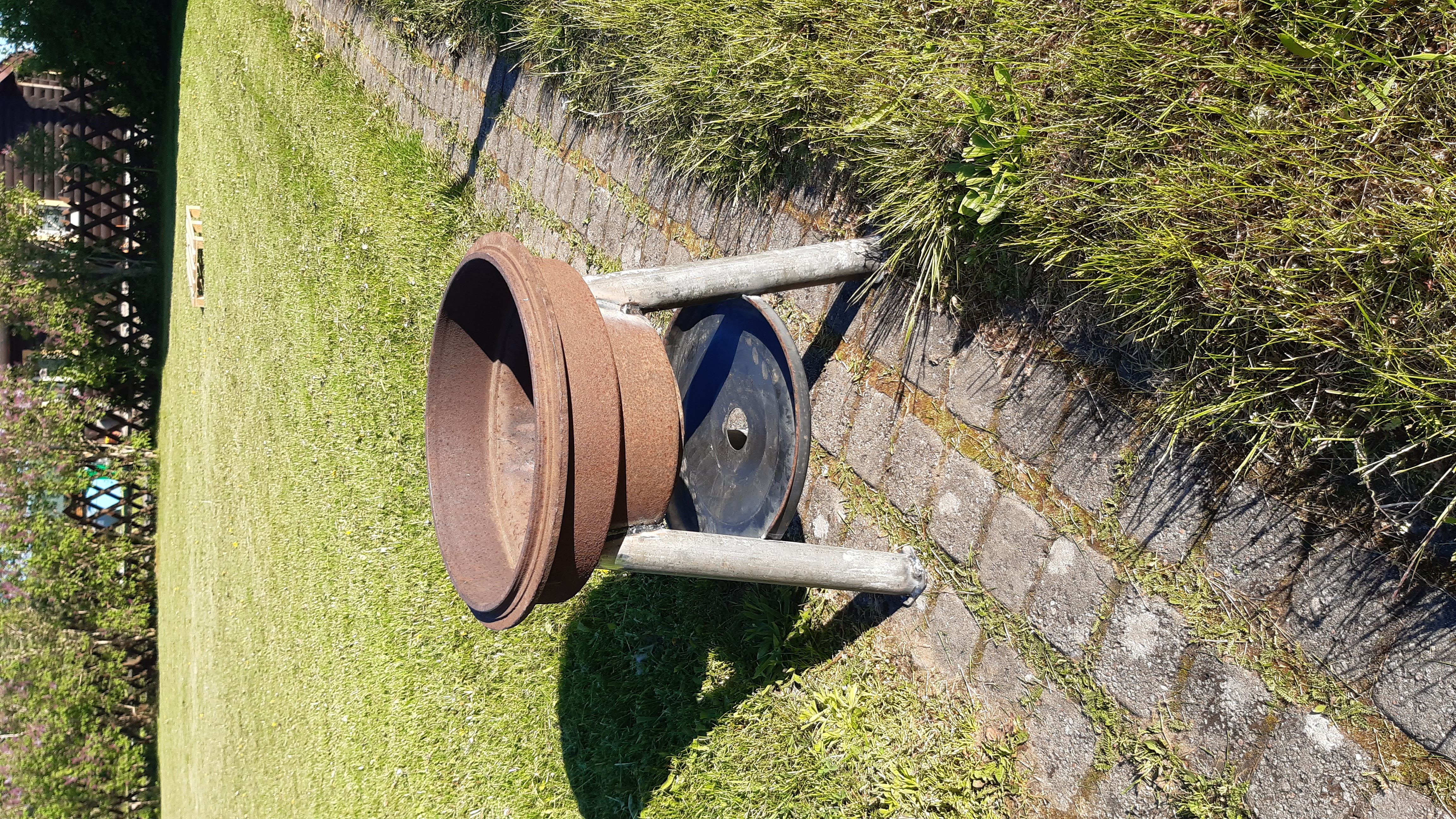 Veoka haagise velg ja propaaniballon olid materjaliks. Balloon sobis hästi sinna velje rummuauku. Ballooni alla sai rist tehtud,et maas püsiks ja Motonetist leidsin peaagu õige mõõduga roostevaba grillresti, mis tänaseks küll garaažis olles jumala rooste läinud. Läbipõlemise-roostetamise ohtu minu eluajal ei ole. Materjal ikka väga paks.