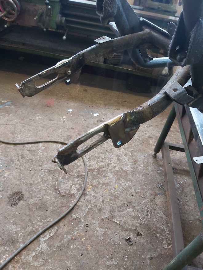 Tegin sõbraga koos uued amordi kinnitused enne kui raami lahti võtsin, sest nn uued ostetud amordid on uuema analoogi omad ja veidi pikemad. Ilusamad ka,vedrud kroomitud. Uuemaid tahtsin, sest need vanad on juba nö uuena jube vedelad ja tahtsin lihtsalt paremaid amorte-vedrusid. Samas ei tahtnud midagi liialt nähtavalt muuta, et kõrgus ja välisvaade jääks peaaegu originaaliks. Esikahvlil tegin uued kinnitused ülesse(jäävad tiiva all mitte nähtavaks) ja tagant lasin alla hargi küljes olevaid kronsasid. Esimeste amortide kõrgemale tõstmine tingis esiporitiival oleva nn tööriista kasti põhja ülespoole tõstmist nii a´5cm võrra. Oleks võinud ka nn uuema esitiiva hankida, kus seda kasti sees pole, kuid soov on see kast sinnna ikka alles jätta. Lihtsalt nüüd sinna ei mahu enam tööriistad vaid midagi 1-2cm paksust.