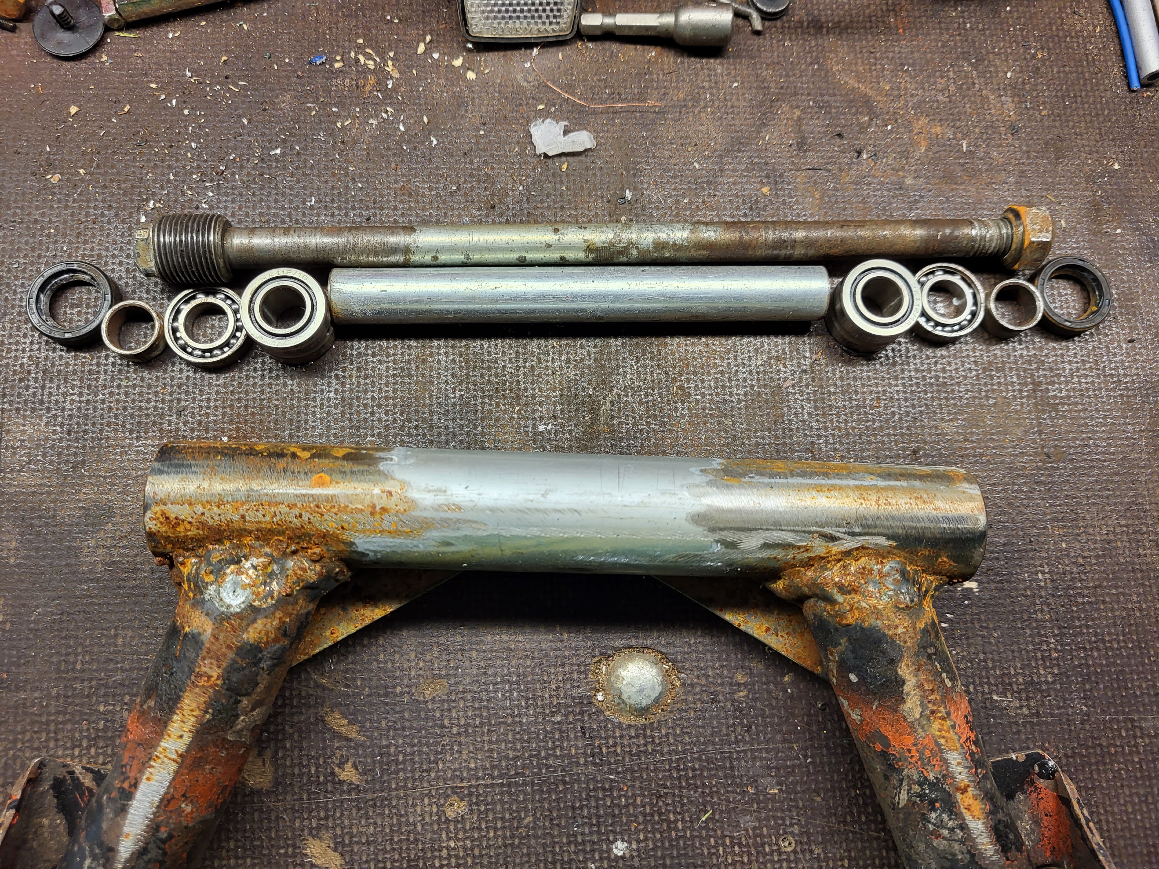See eeldanuks mingit täpset sättimist ja ilmselt ikkagi uue kiigetoru valmistamist, sest originaalis puudusid pesad puksile. Sile toru, suht õhukese seinaga oli. Laagritega sai lihtsalt odavalt ja piisavalt hästi ka fiseerituna selle kiige.