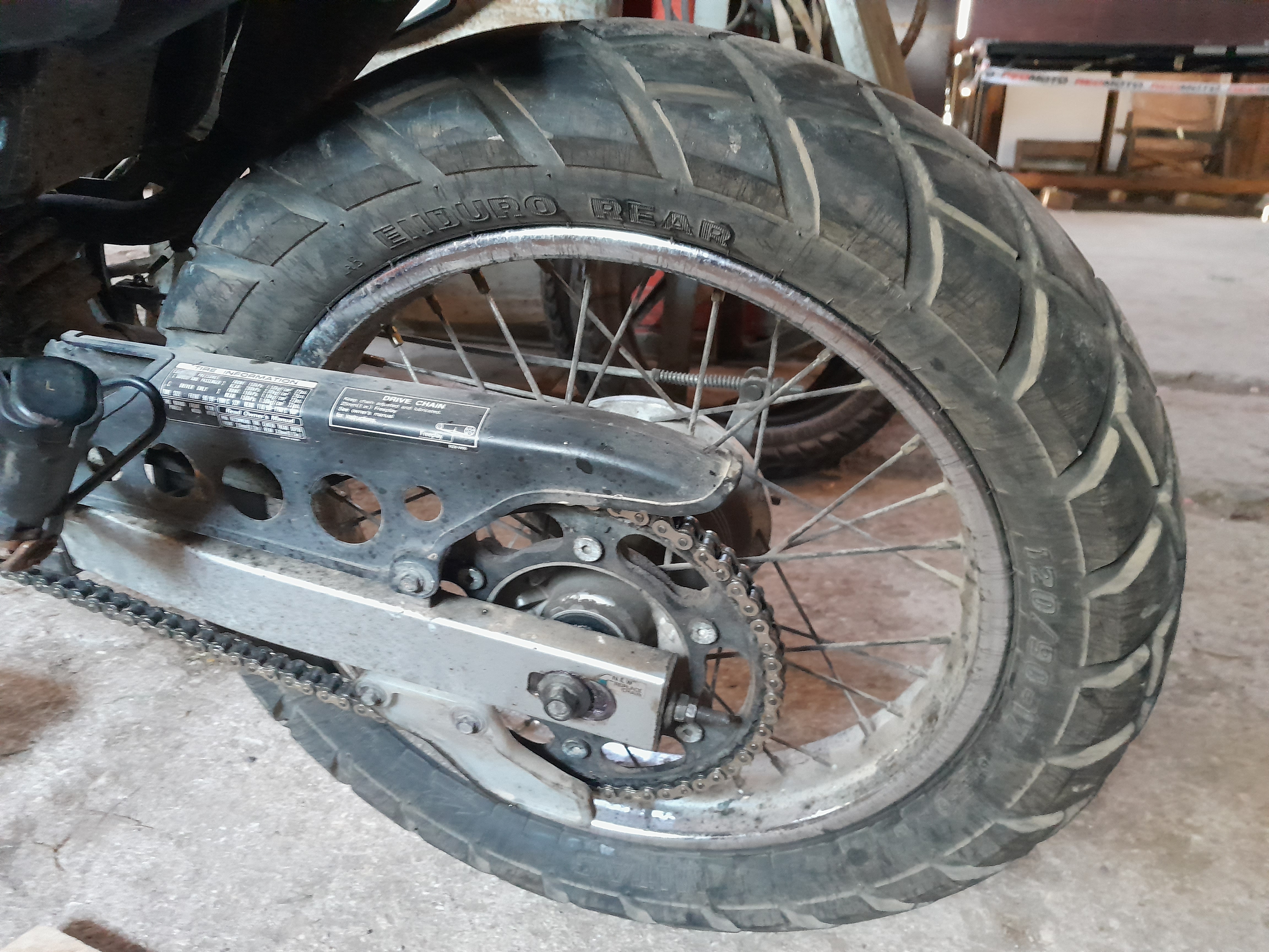 Ja taha sai siis küll pisut originaalilähedasema mõõdu, elik 120/80 R17 Mitase 110/90 R17 asemel...aga sellel muidugi ei vedanud eriti valmistusajaga, ehk tuli leppida 2004a, seega ka paraja "koorikuga" originaali asemel...aga noh, mustrit vähemalt oli pisut enam: