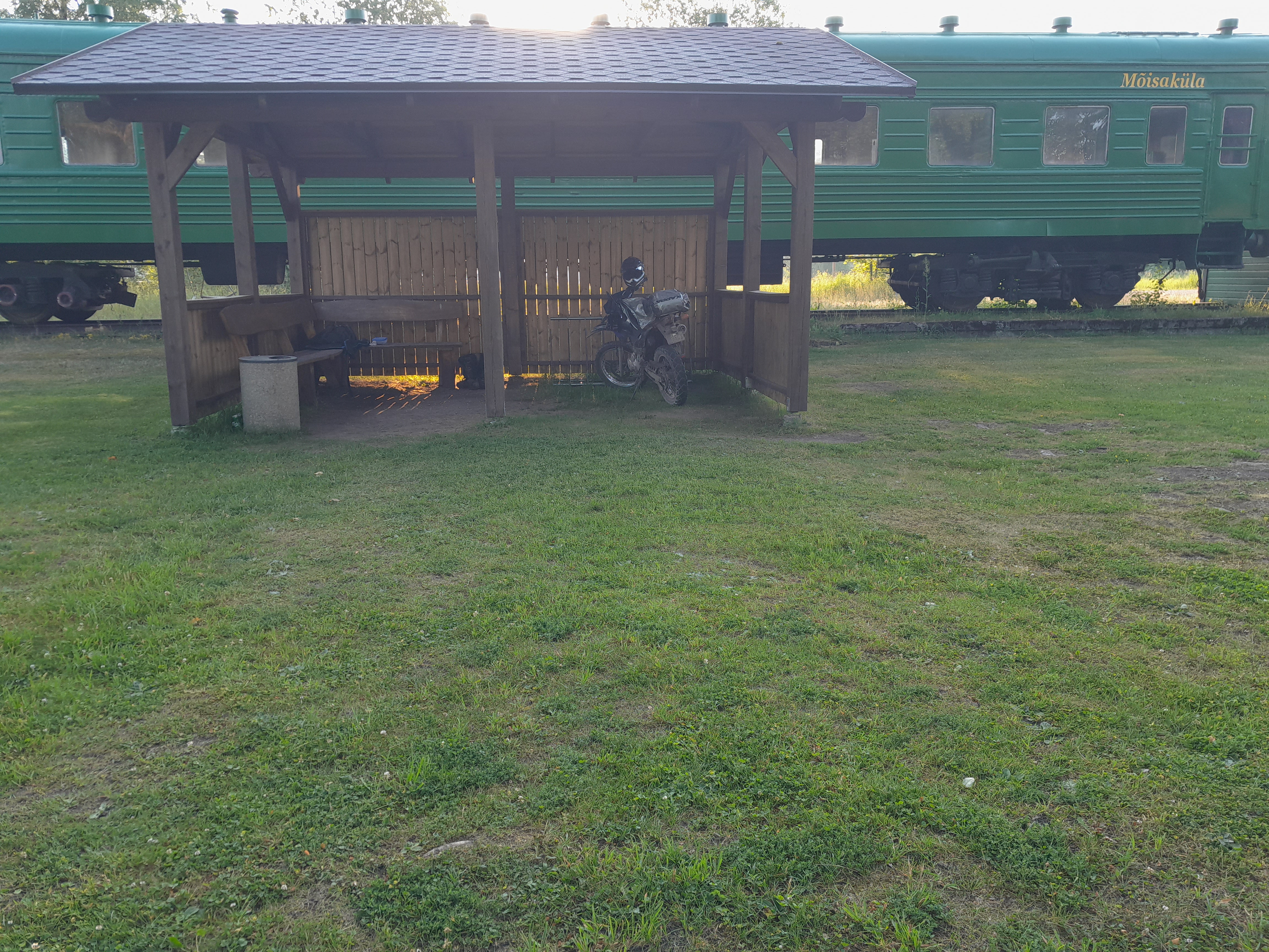 Seega hakkasingi juba vaikselt ööbiskohale mõtlema, sest sisimas aimasin juba, et kui ikka teise Jaanipüha õhtuks (24.06) kodukandis tagasi tahan olla, siis üleliia lihtne see olema ei saa ja parem oleks seekord korralikumalt välja puhata, kui vaid poolteist tundi tukkumist! Kus aga leida hetkel kuiva kohta, soovitatavalt ka sääsevaba? Ning kus häda kõige suurem, seal abi kõige lähem- Mõisakülla jõudes tuli miskipärast mõte raudteeülesõidu kohalt väike haak mööda endist raudteed teha, mis siis tundus, et seal küla vahel TETiga suht pralleelselt kulgeb. Ning voilaa- ükshetk seisis mu teel mingi uhke "muuseumvagun"...kuhu sisse siiski murdma ei pidanud, kuna seal kõrval ka igati viisakas varjualune nii motikale, kui ka täpselt mulle mõeldud pikutamispingiga!?