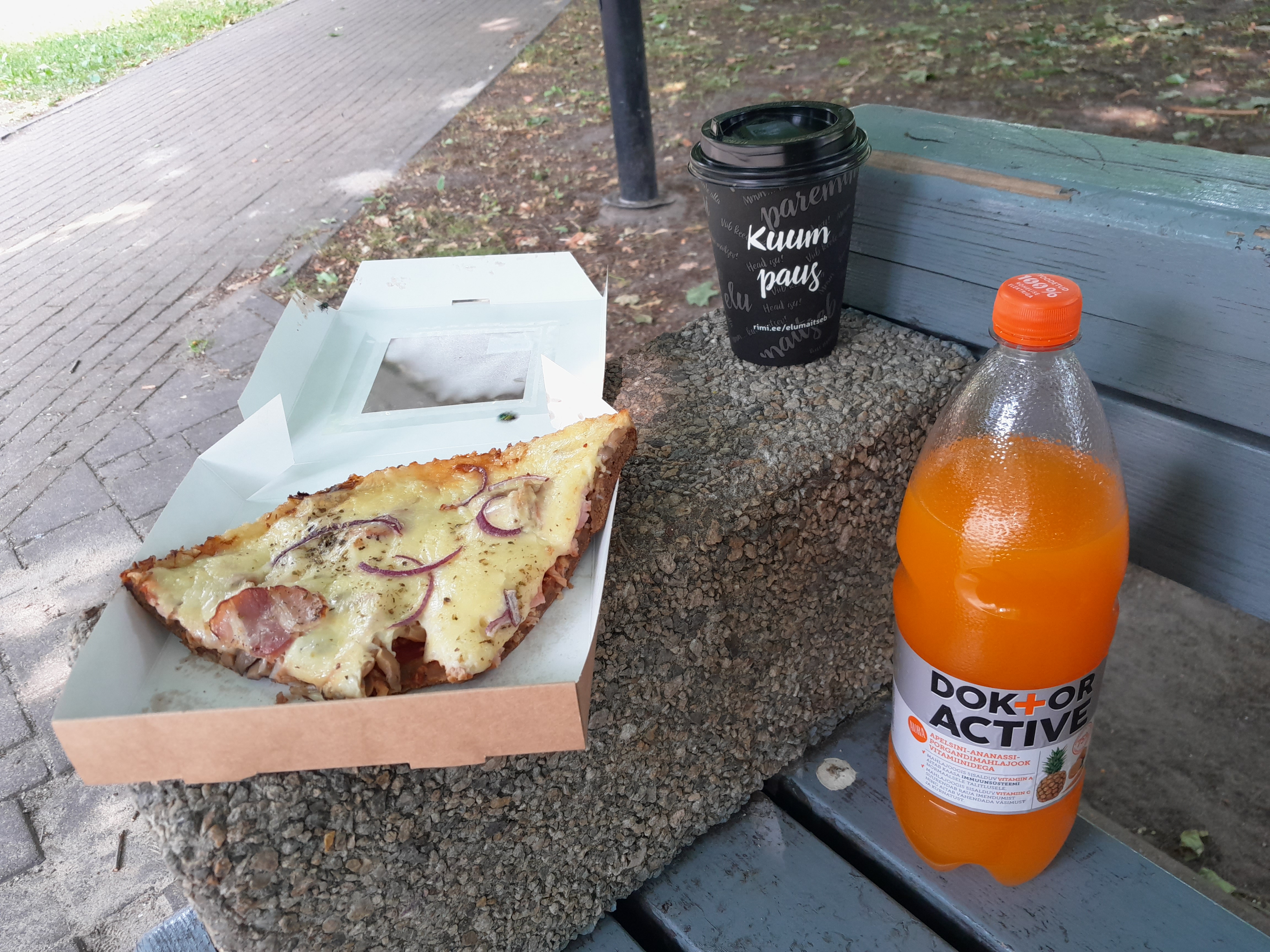 Aga kuna taas võimust võtva 31-32kraadi palavaga, ning oma seljas/jalas/peas oleva kolaga, lõpuks end kuhugi linaga laua taha siiski ette kujutada ei suutnud, andsin alla ja lõpplahendasin olukorra ikkagi vaid mingi rammusama Rimi pitsalõigu, kohvitopsi ja suure külma joogiga! "Noh, "öko-TET" siiski..." proovisin siis endale tekkinud olukorda kuidagi vabandada, kui kuskil pingiserval lauakest katsin: