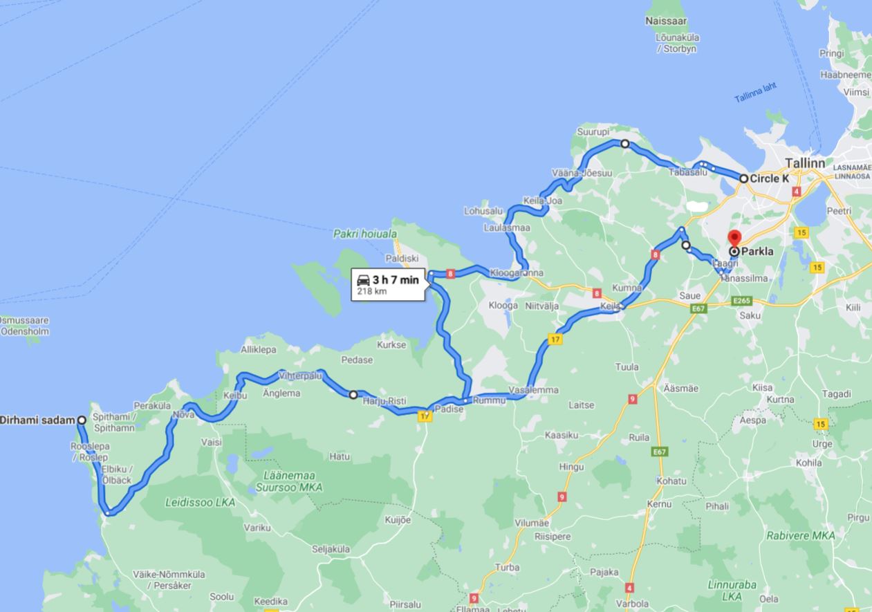 Stardiks 12:00 (koguneks natuke varem) Haabersti CircleK-st ja suunduks läbi Tabasalu-Muraste esmalt Paldiskisse (või noh sinna tanklasse, mis on sissesõidul) ja sealt siis Dirhamisse. Kui tagasi tulla läbi Keila, siis ca 220km kokku.
