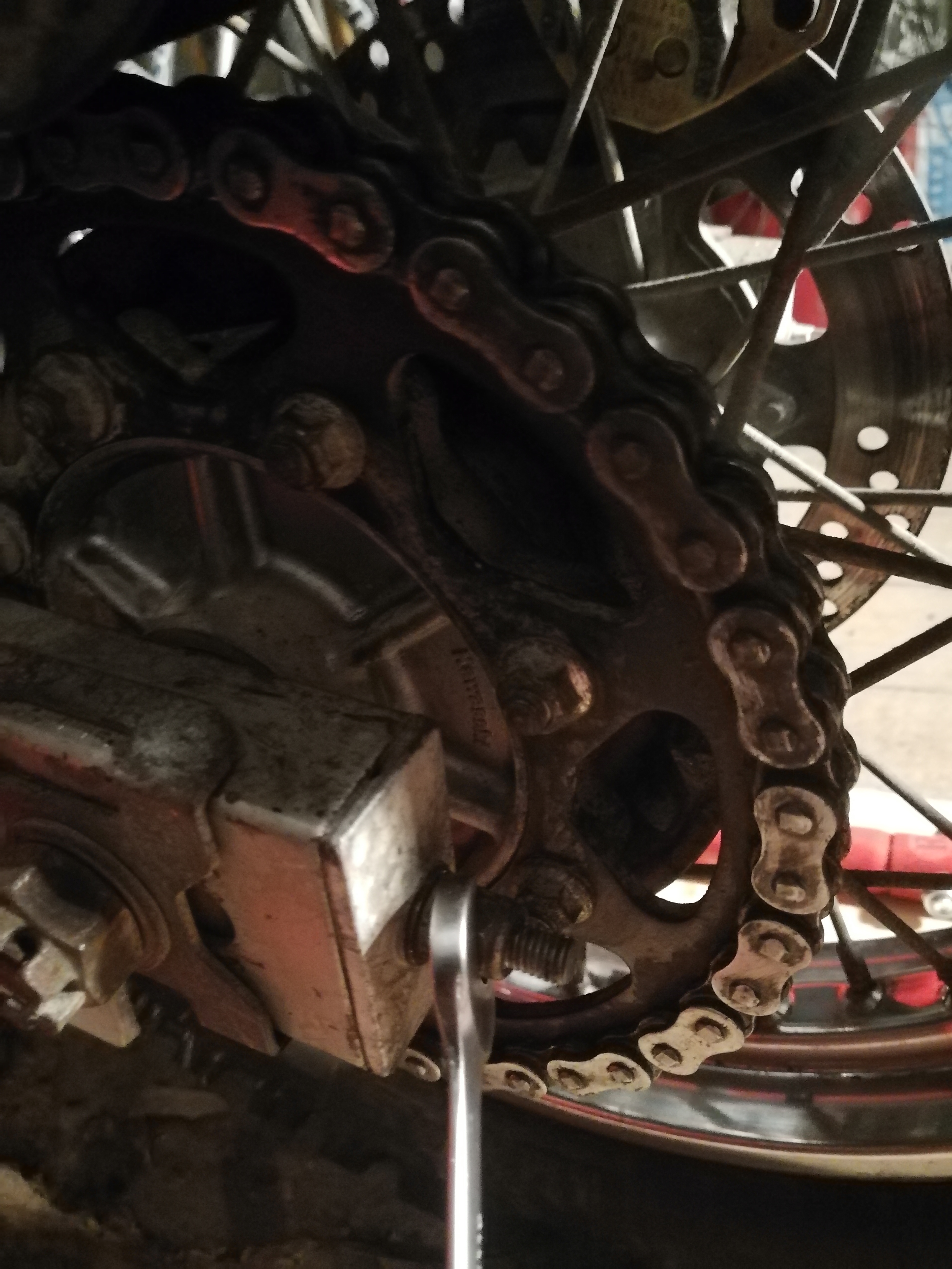 Clymer ütleb et KLRi ketil peab lõtk olema, esimese ja tagumise hammaka keskkohast mõõtes, 5-6 sentimeetrit. Ja õnneks oli sel ketil, vaatamata veninud välimusele, pingutusruumi veel küll. Jäi pärast pingutusmutrite kruvimist kuskil 5,5 cm.