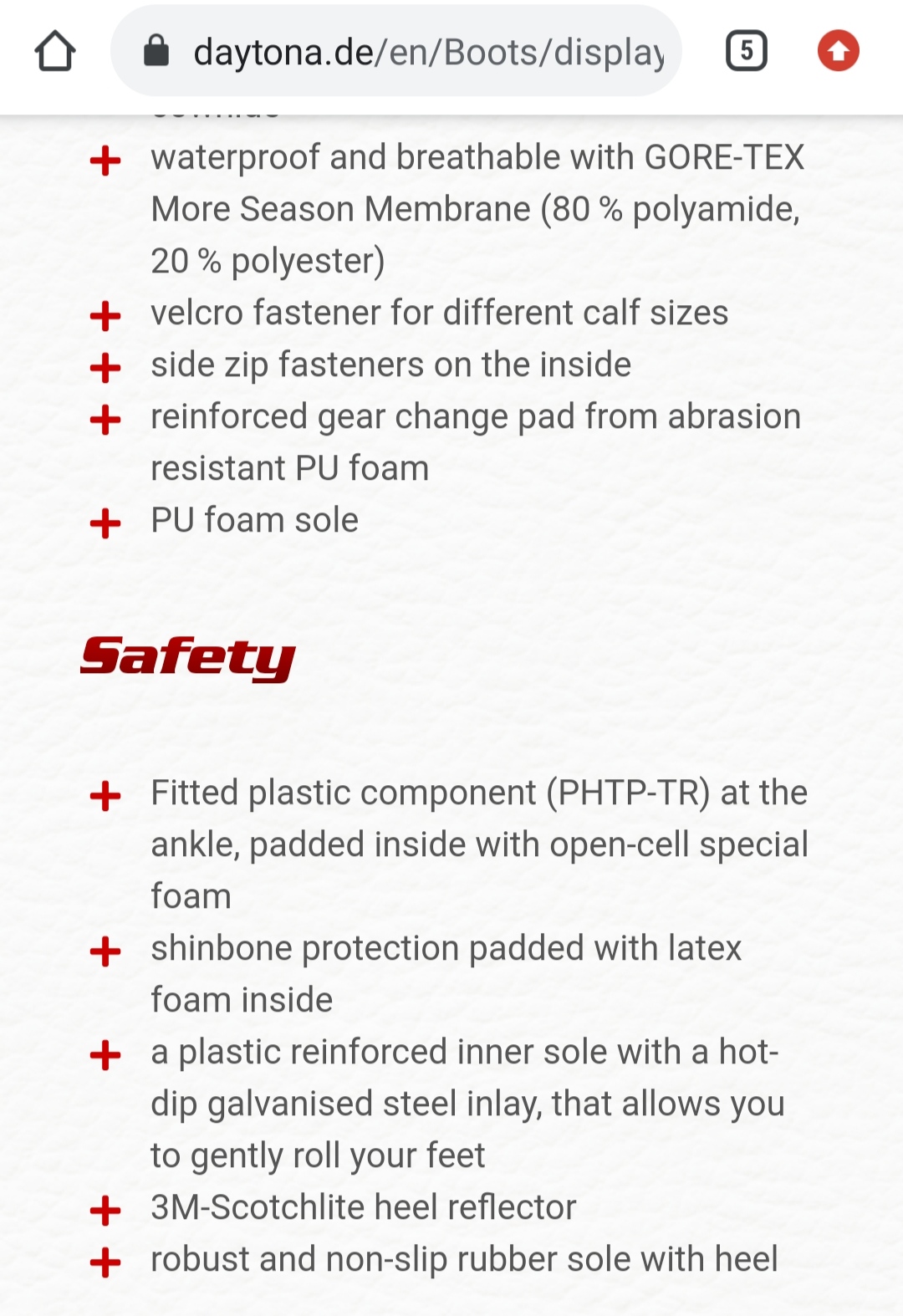 Mõni aasta tagasi käisin Norra reisil koos tsikiga kraavis, jalg jäi tagaratta ja puu vahele. Daytona saapad tegid seda mida vaja. Järgmine päev oli jalg veits tunda, aga ilma nende saabasteta poleks ise sealt ära sõitnud ilmselt.