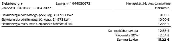 urmas66 kirjutas: ↑01 Juun 2022, 22:50@ranel kirjuta siis lahti kuidas käib arvestus tunnipõhisel paketil,kui kuu lõpus on arvel üks hind,millega korrutatakse kulutatud kilovatid? Minule selgitas klienditeenindaja mingist keskmisst päevast, mis minu tundidega kuidagi saadakse ja siis neist päevadest saadakse omakorda kuu keskmine jne. Mul puudub viitsimine kõike seda tarbimist mis mul on läbi arvutada, aga Elektrumile saatsin kirjaliku päringu just selle kohta kuidas käib arvutus,mitte mida igas paketis arvestatakse. Mul on ka vanem kindlustusega börsi pakett,mille tingimused muutusid selle kirjaga