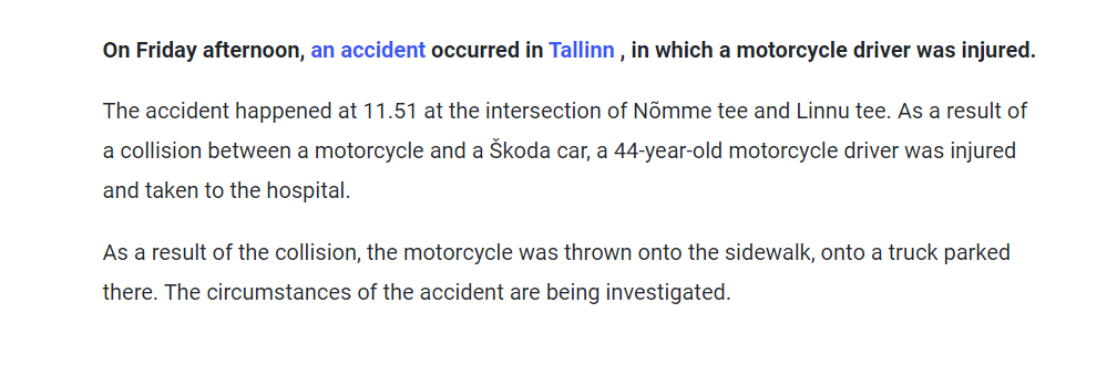 Kell 18.01 teatati avariist Tallinnas Smuuli teel Liikuri tn 46 juures, kus mootorrattast Kawasaki Z750 juhtinud 45-aastane mees kaotas parempööret teostades sõiduki üle kontrolli ja paiskus teele külili. Mootorrattur viidi Ida-Tallinna keskhaiglasse.
