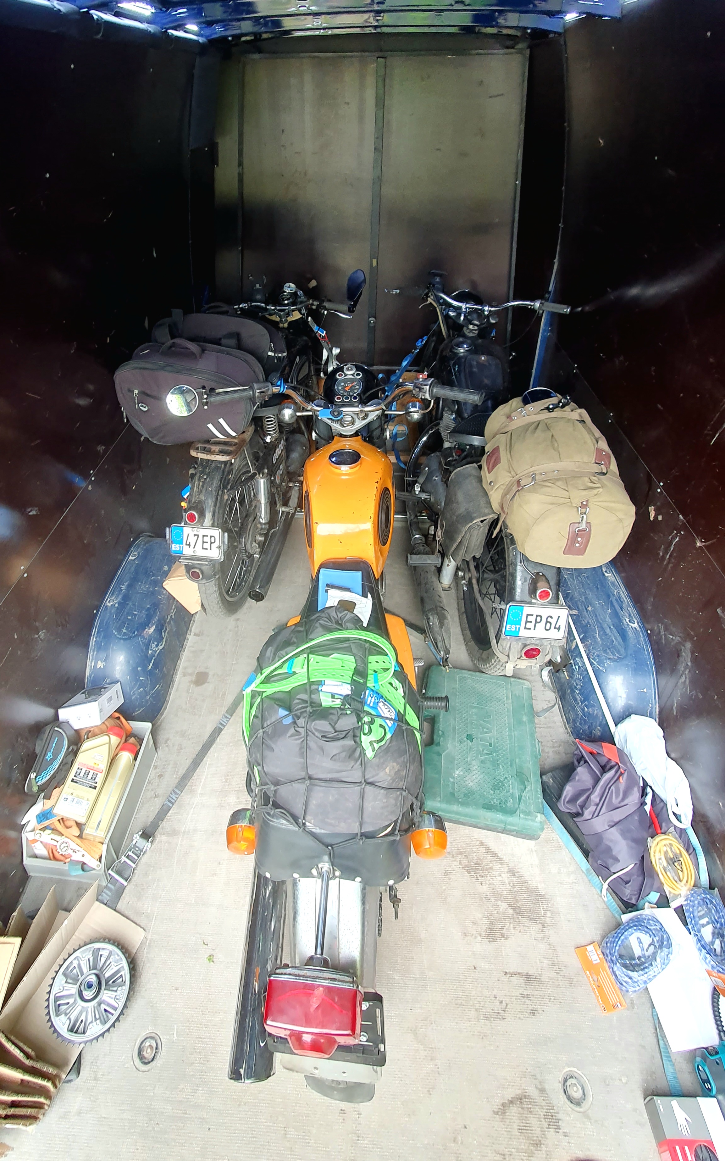Riga7 (1972) 49cc -> Kovrovets K58 (1958) 124,7cc -> K58@100 173,7cc-> Minsk M103 (1963) 124,7cc -> Jawa 360 + velorex 560 (1972) 344cc -> Jawa 559 (1965) 248,9cc -> Kovrovets K-175 (1958) 173,7cc -> Triumph Bonneville T100 (2019) 900cc