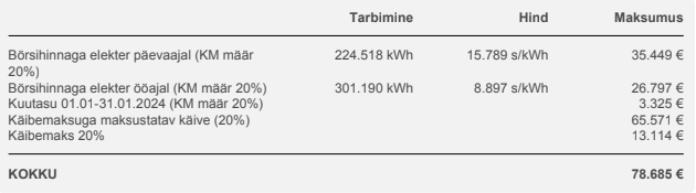 Mul korterielanikuna tuli kw hinnaks arvesumma/kw kogusumma 24,29 sentiMaaks kirjutas: ↑07 Veebr 2024, 08:30Ikka õieti arvutasid? Kõikide tasude all mõtlesid siis mida? (vihje: aksiis, taastuvenergia tasu, võrgutasu, käibemaks, ampritasu)moilo kirjutas: ↑07 Veebr 2024, 00:18Huvitav.