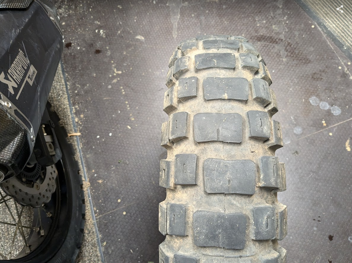 Kogemuse jagamise mõttes - selline näeb välja 13k km sõitnud tagumine Motoz Rallz, Tenere 700 alt. Pakun et u 70% sellest kruus ja mets, ülejäänud asfalt. On päris valjud, aga klotsrehvi kohta OK pidamine nii märjal asfaldil kui ka metsas/kruusal. Kallis rehv, 150/70/18 mõõdus 200+ eurot, aga per km tuleb võibolla isegi odavam, kui Mitas E10...