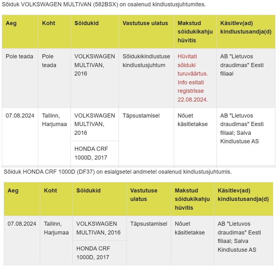 Novembris 2024 minu autole tehtud kahju, mille hüvitas kasko koostöös süüdlase kodukindlustusega, ei kajastu üldse kuskil. Kusjuures teavitasin juhtunust ka politseid, sest langetatav puu kukkus teele ette ja sõitsin sellele otsa. Kuna varuosade tellimine kestis, siis töö tehti jaanuar 2025 ehk maksti siis ilmselt Vehole välja peale seda. Sama ka ettevõtte veokatega, mitte üks kasko juhtum sealhulgas ka eelmisest aastast, ei kajastu lkf lehel. Sel aastal pole ühtegi olnud,et oma autodest vaadata.