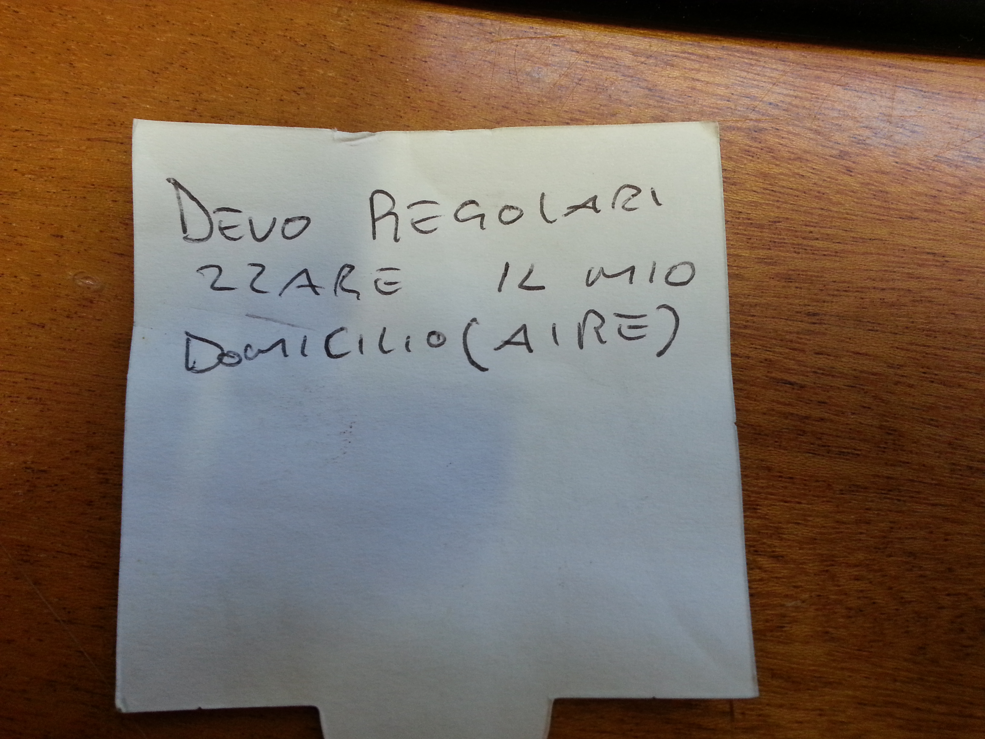 P.S. Guugl tränsleiti pole mõtet pakkuda.Tõenäoliselt on see tekst ikkagi: devo regolarizzare il mio domicilio - filoloogil natsa lihtsam