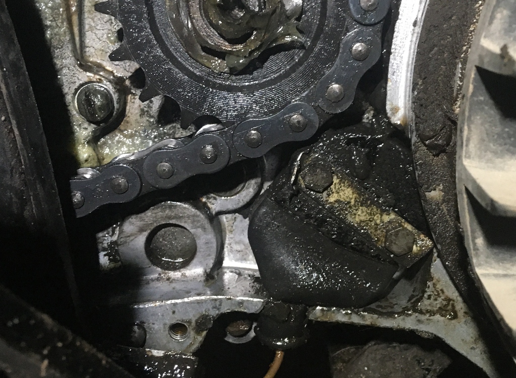 Üsna kehv on seda vasakul asuvat lapiku peaga kruvi lahti keerata, et see vasest kontaktiga plaat sealt võlli pealt kätte saada. Võibolla oleks natuke parem keerata tagant, keti poolt, aga ei viitsinud ketti ja ketikaitsmeid maha võtta (ei olnud päris kindel, kas sellest ikka oleks ka rohkem abi olnud) ja keerasin võlli sellisesse asendisse, et kruvi jäi alla (vist oli vaja 4. käik sisse panna selleks) ja sai keerata sealt kohast kust lüliti juhe välja läheb. Kruvikeeraja ei jää kruvi peale täie pinnaga toetuma ja üsna kehv oli keerata, kruvi käis kohati ka raskelt, aga kuidagi lahti sai.