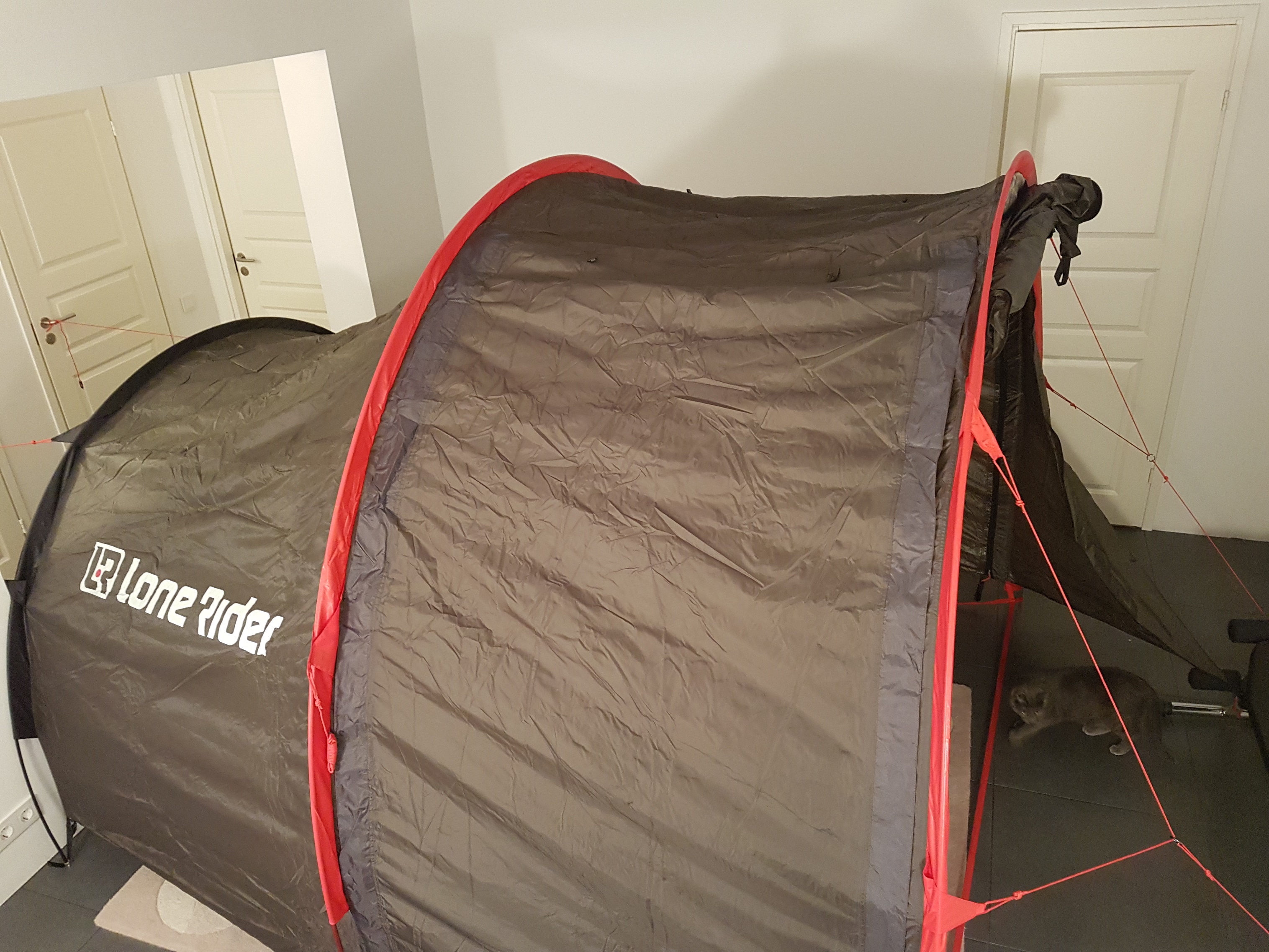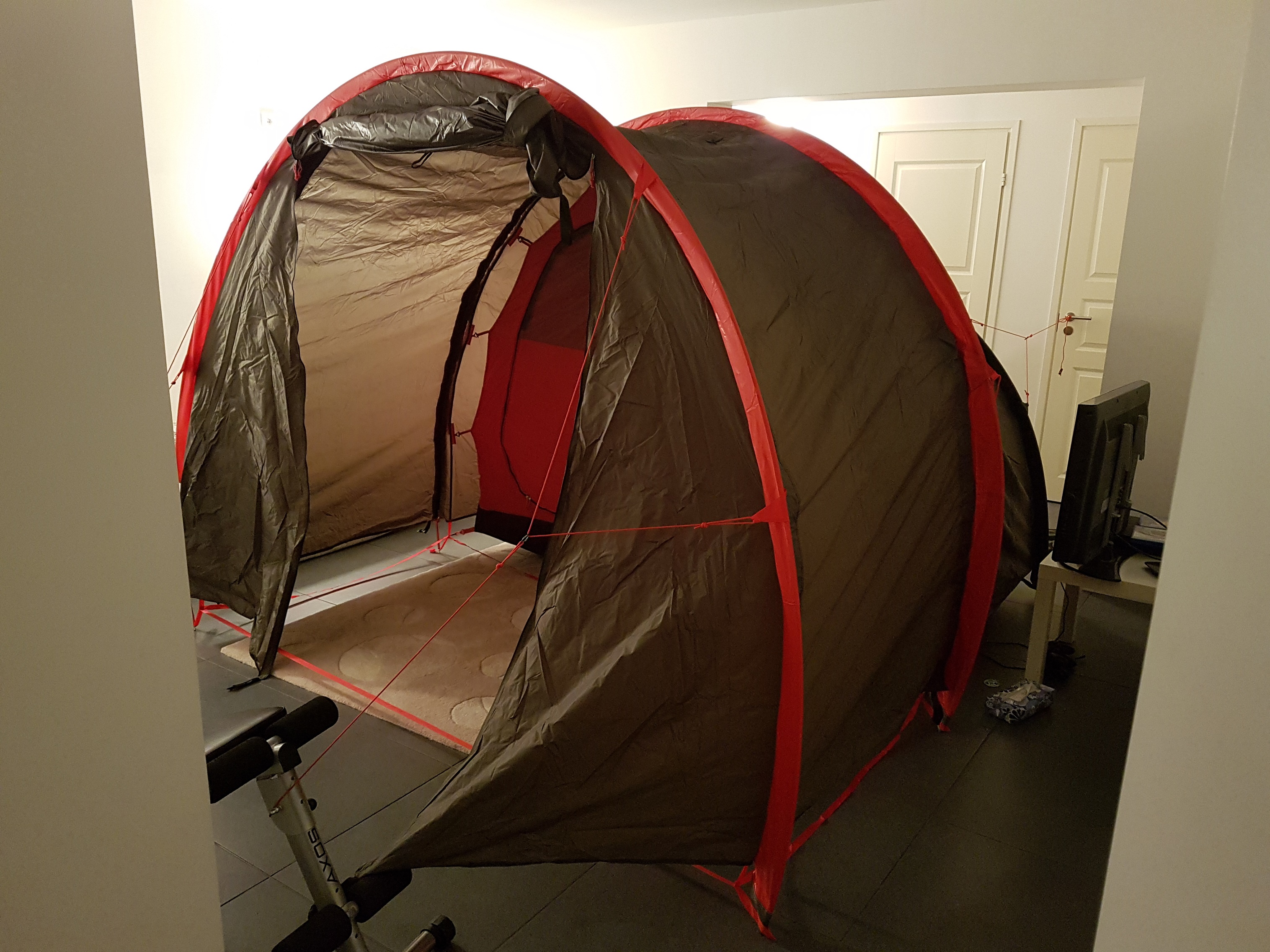 Sidusin telgi ühe otsa suvalise nööriga ukse külge kinni ja tõmbasin telgi püsti. Teise otsa nöörid sidusin pingi külge. oli tõesti nii lihtne kui reklaamis väidetakse. sisetelk on juba küljes. seega kokkuvõttes tundub selle suure telgi paigaldamine lihtsam kui nii mõnegi väikse kahekihilise üles panek.