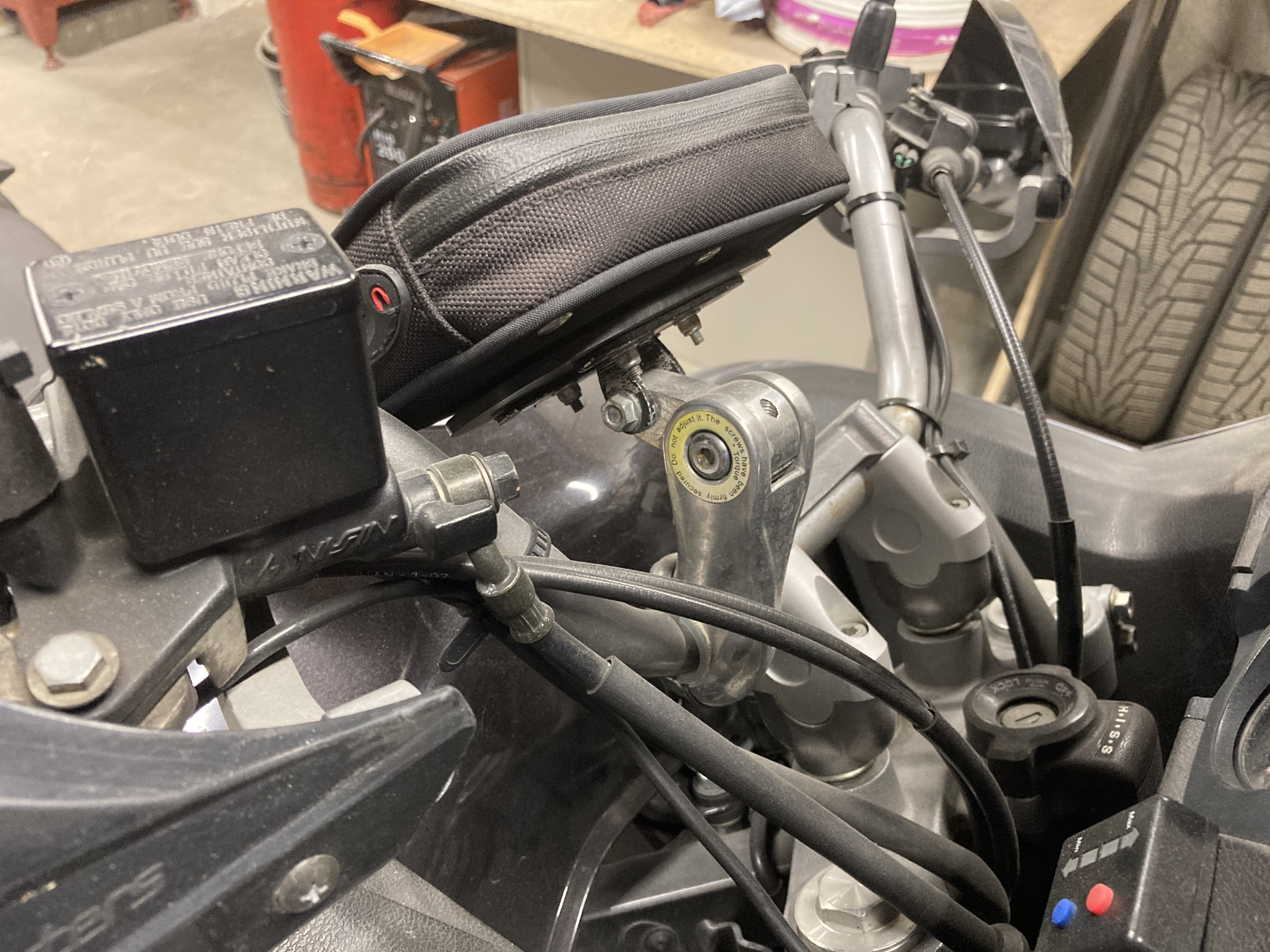 Mina kasutan sellist samodelkat. Põhimõtteliselt on insenerid selle välja mõelnud jalgratta leknsu hoidikuks. Sellel on täitsa oma nimi ka olemas aga ma enam ei mäleta. Lisasin sinna külge väikese omatehtud detalili, et GPS kotti kinnitada ja asi toimib tänaseni väga hästi. Võimalus on küll nurka muuta aga puudus on jah see, et küljepeale ei ole võimalik seda keerata saab nurka muuta ainult edasi ja tagasi. Kuna jalgratta lenks on keskelt jämedam tsikli omast, siis tuli kasutada plastikust muhve lenksule kinnitamiseks. See vidin on kaupluses müüa koos toruga, mis läheb koonusega esihargi torusse. Oleks selle toru ka kinnituse ehitamisel kasutusse jätnud aga kuna ei oma treipinki ega freesi, siis tuli see väike vahetükk käsitsi alumiiniumist välja viilida- GPS kotis on intercom ja GPS ning asi püsib lenkul juba mitmed tuhanded km kindlalt paigas.Konstruktsiooni täiustades on võimalik ilmselt ka külgedele nurki muutma panna.