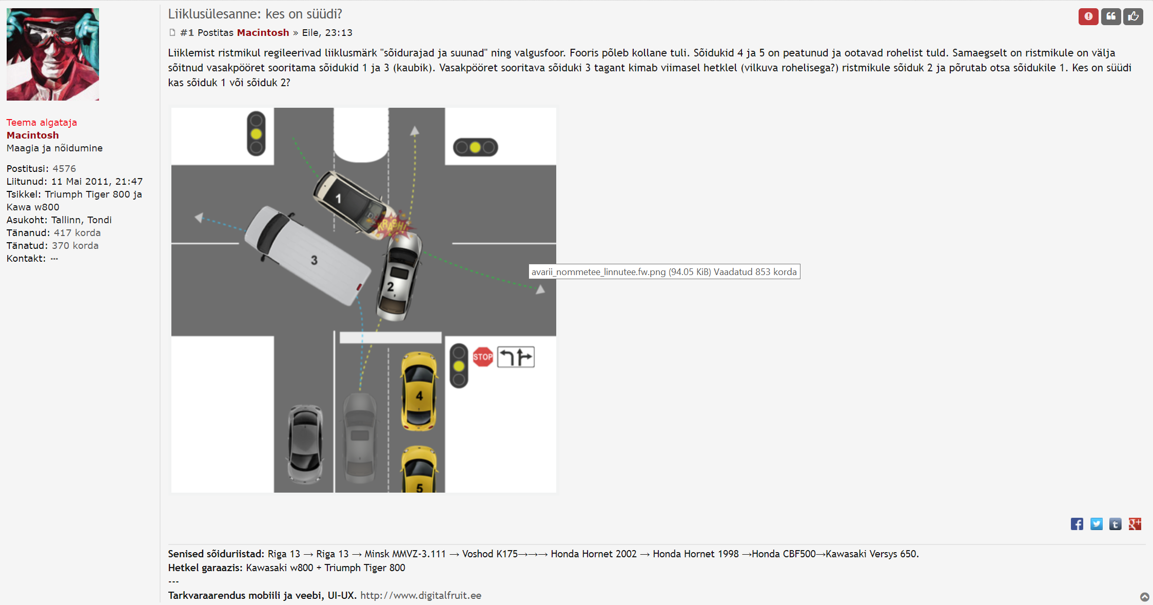 Ma isegi ei viitsi nr 1-le väga kaasa tunda kui aus olla - temale on vastutulijate sõidusuundade märgid ju nähtamatud, seega see pole argument et "ma arvasin et ta keerab vasakule". Sõitma peab enda märkide järgi ja enda aknast paistva pildi järgi, mitte eeldama et mis märgid teistel on või ei ole. Kõik on ilged spetsid mingite kuupjuurte tasemel skeemide kokku mõtlemises, kõik ristmikud on igatpidi pähe õpitud jne, aga kõige lihtsam ja universiaalsem reegel et "kui paremalt keegi tuleb siis stopp, tal on eesõigus" kipub ära ununema.