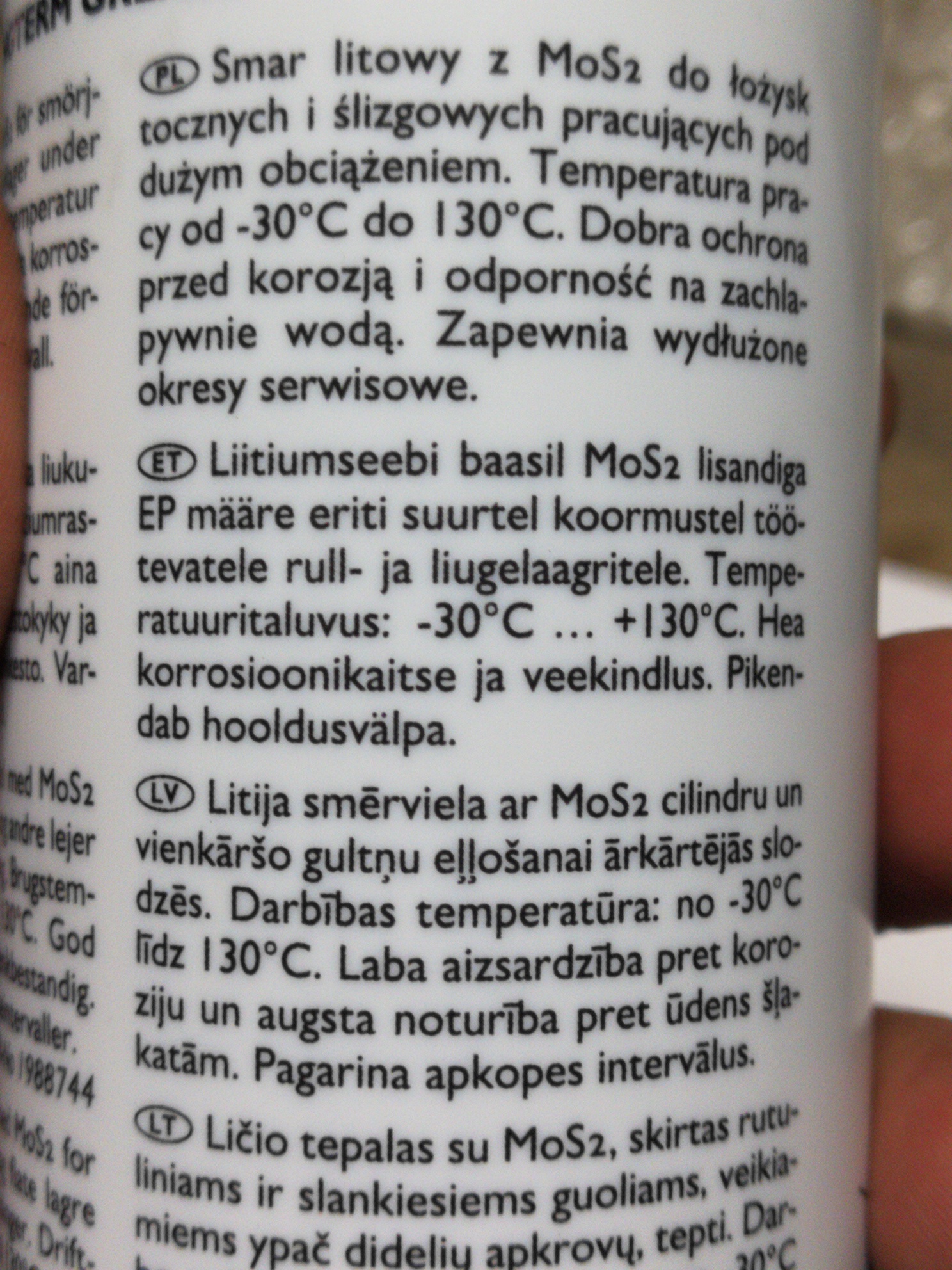 Mõeldud eriti suurtel koormustel töötavatele laagritele. Nagu ütelb etiket. Aga võib olla, kui see on sobilik tankidele ja ekskavaatoritele, siis mootorratta spidomeetri mätsib see nii kinni, et miski ei liigu?