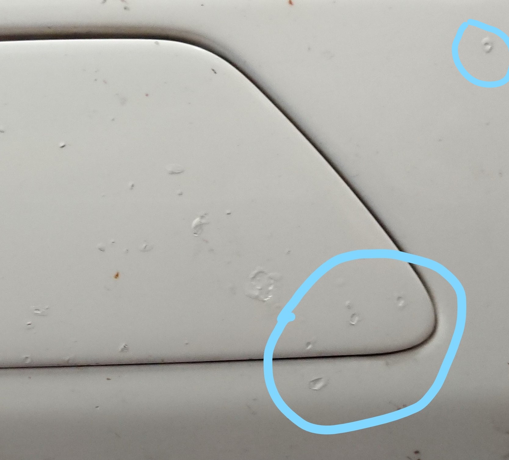 Allpool näiteks tulepesuri kate. Kriimud täidetud kevadel 2018. Allpool sinisega näidatud täkete parandamine on minu jaoks piisav. Ülemine nurk on liiaga pandud, väikese poroloonketta ja pastaga peaks suht siledaks saama. Seni pole viitsinud.
