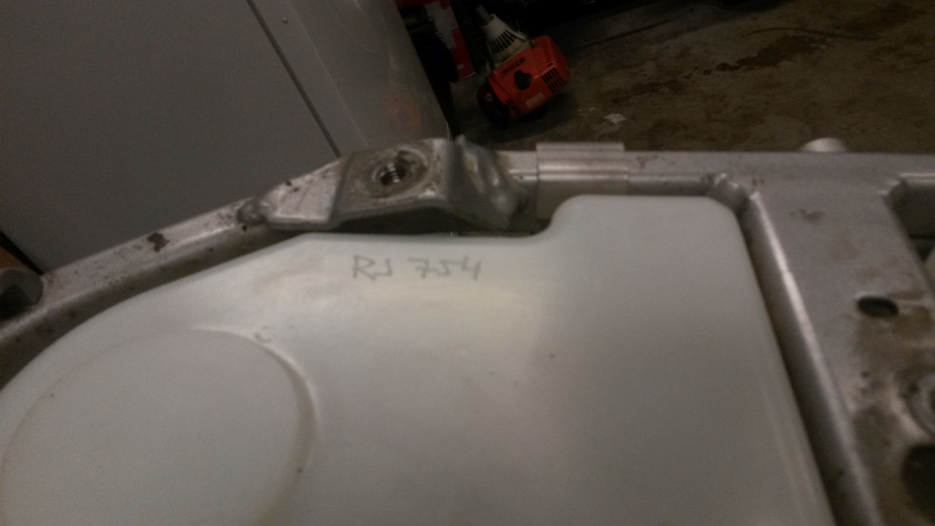 Hommik algas 120€ -se tagasilöögiga. Õigemini üritasin uue tüki arvelt kokku hoida, saades teada palju see maksab (6000300500001S ENGINE SUPPORT LEFT 07 - 115.-). See ava, mille külge kinnitub "laibakas", on ajapikku keerme kaotanud. Algul tahtsin uue osta. Siis mõtlesin et lõikan uue keerme sisse, paksust nagu on detailil. Paraku suutsin keermelõikaja sinna sisse ära murda. Üllatav et nii pehme materjali sisse nagu alumiinium võib olla nii raske keeret lõigata. Keermepulk muidugi ei ole ka just ülemise riiuli kaup aga teraslati sisse polnud keermestamisel probleeme. Õliga ka ei koonerdanud.