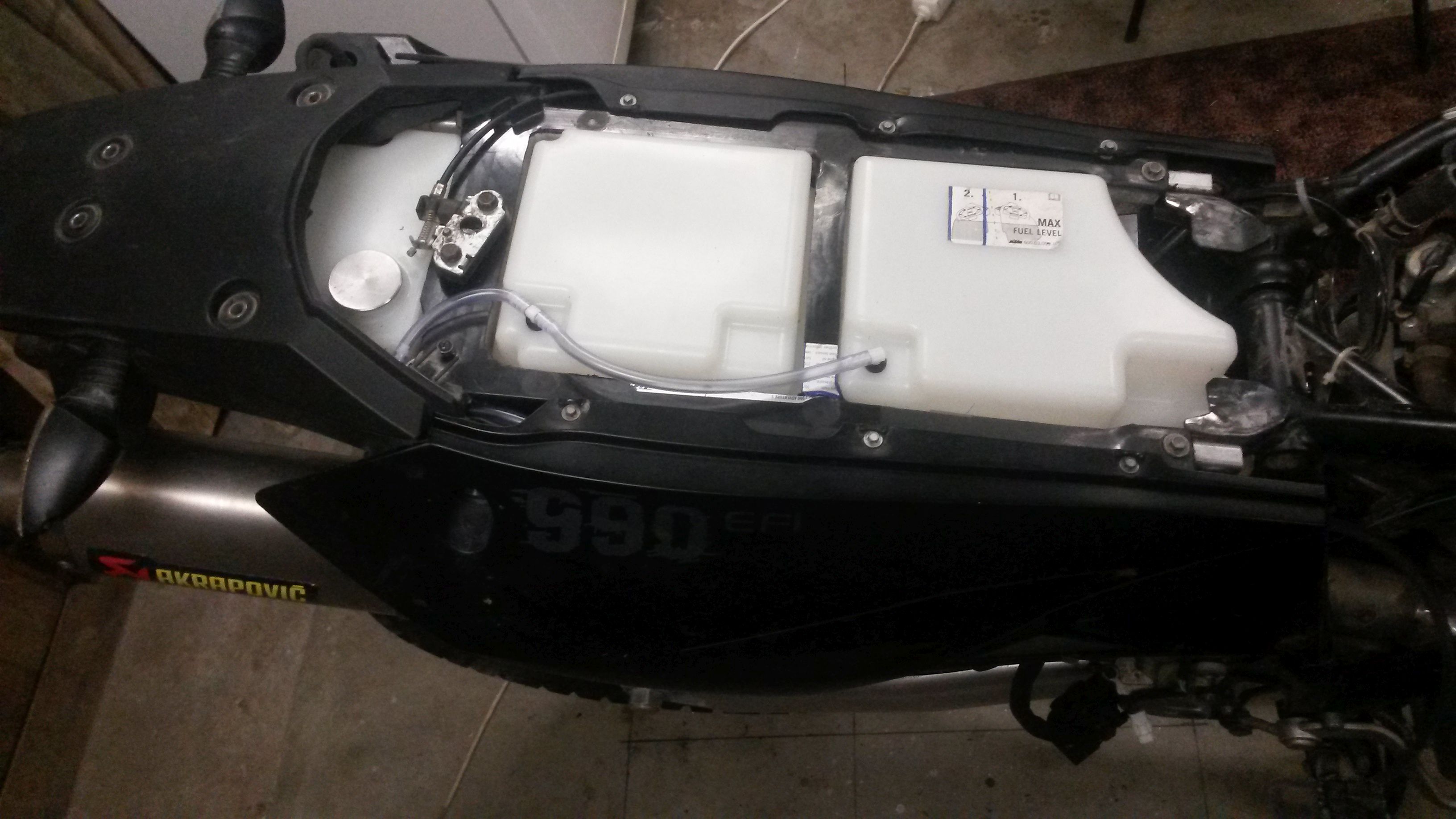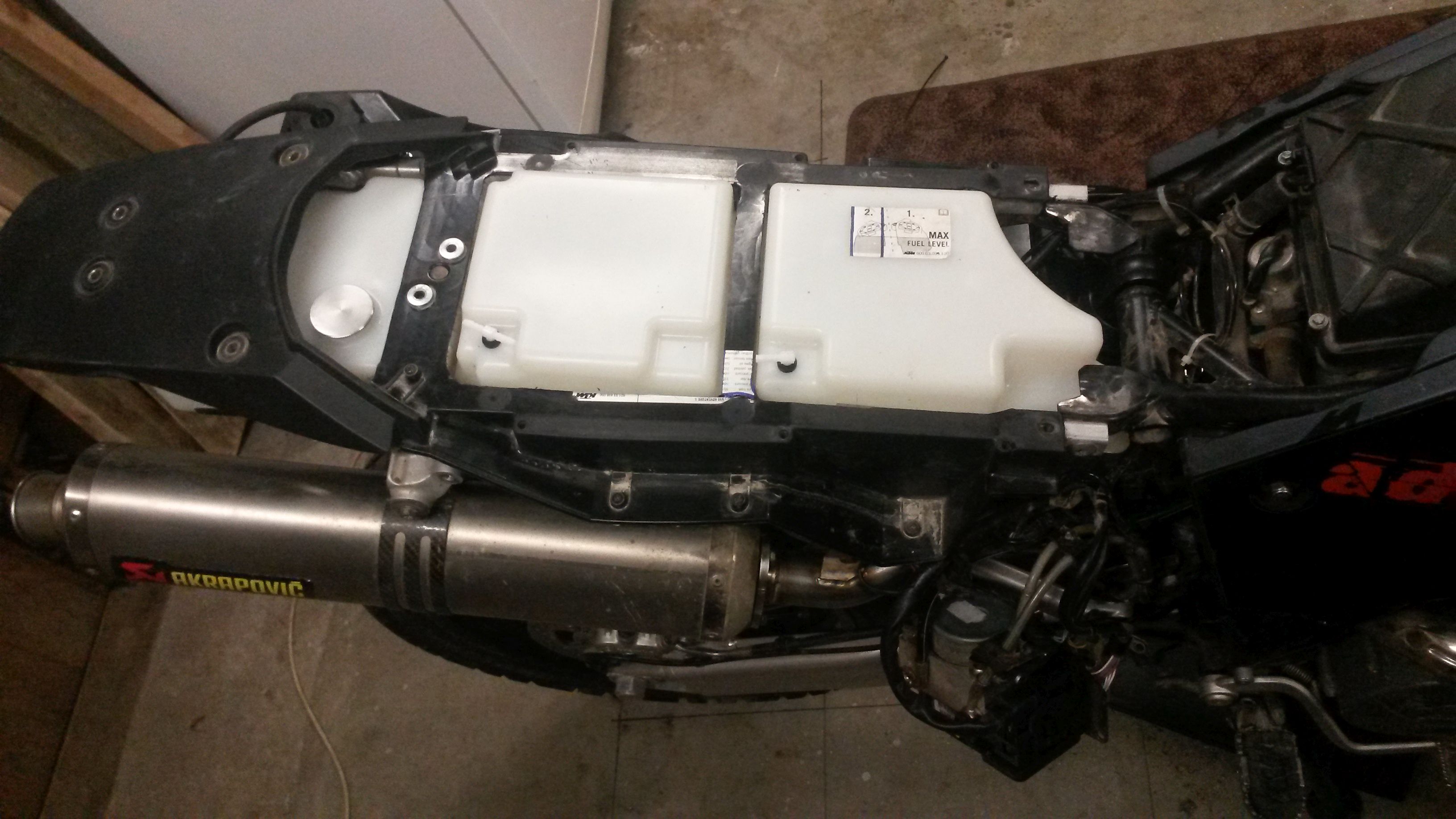 Nüüd kus vasak sumpa on läinud, on ruumi kohe kõvasti juurde tulnud. Isegi peale paagi paigaldamist. Varem oli tükk tegu et Scottoiler kuhugi mahutada. Praegu ruumi nii laialt sadulaaluse paagi ja amordi vahel et mõtle või mingi panipaik sinna välja. Paak on tehtud kahe sumpa arvestusega, eemaldatud leegitoru kohale oleks paagi kuju täiendades veel ca 1l kütust mahtunud