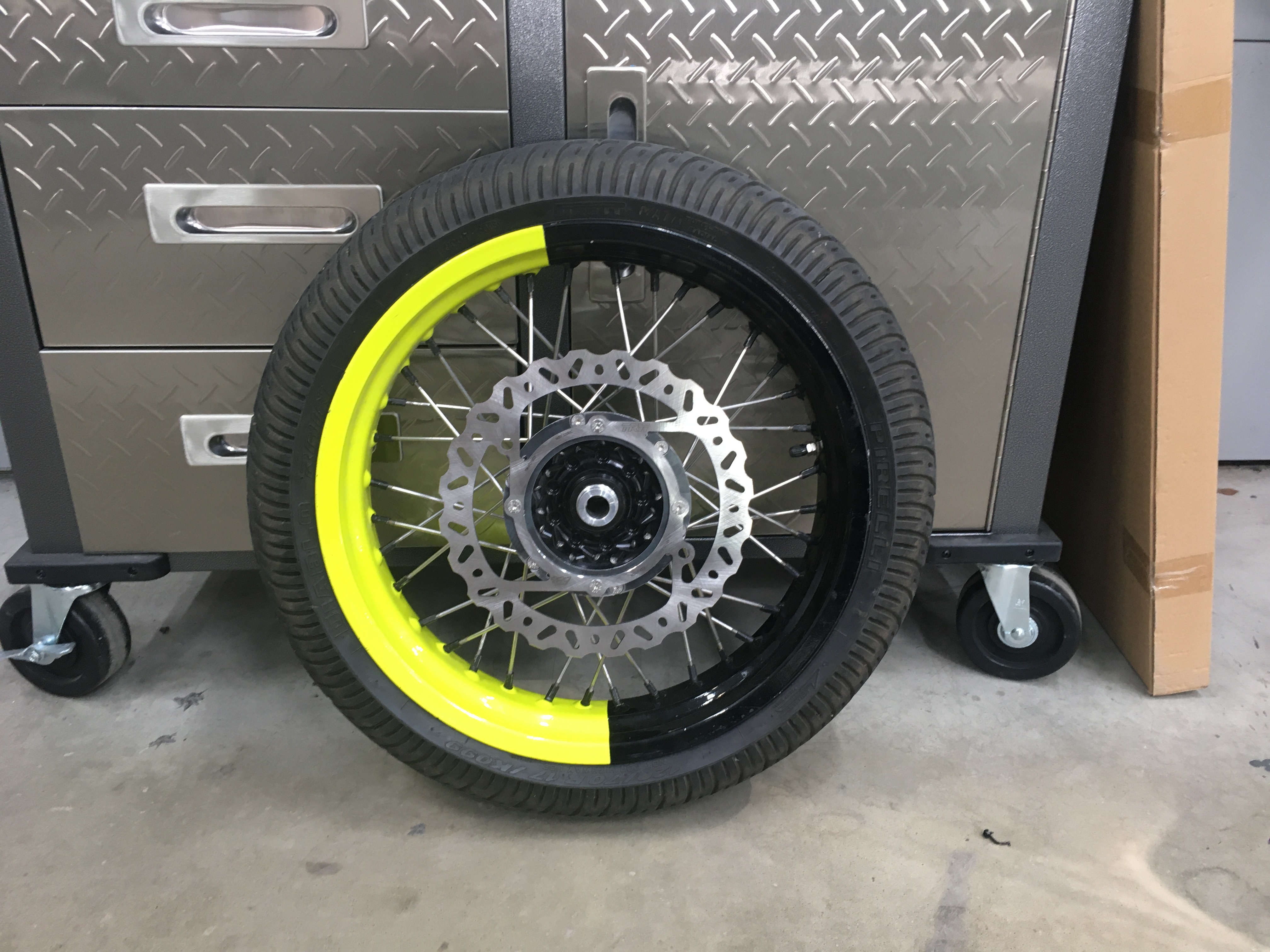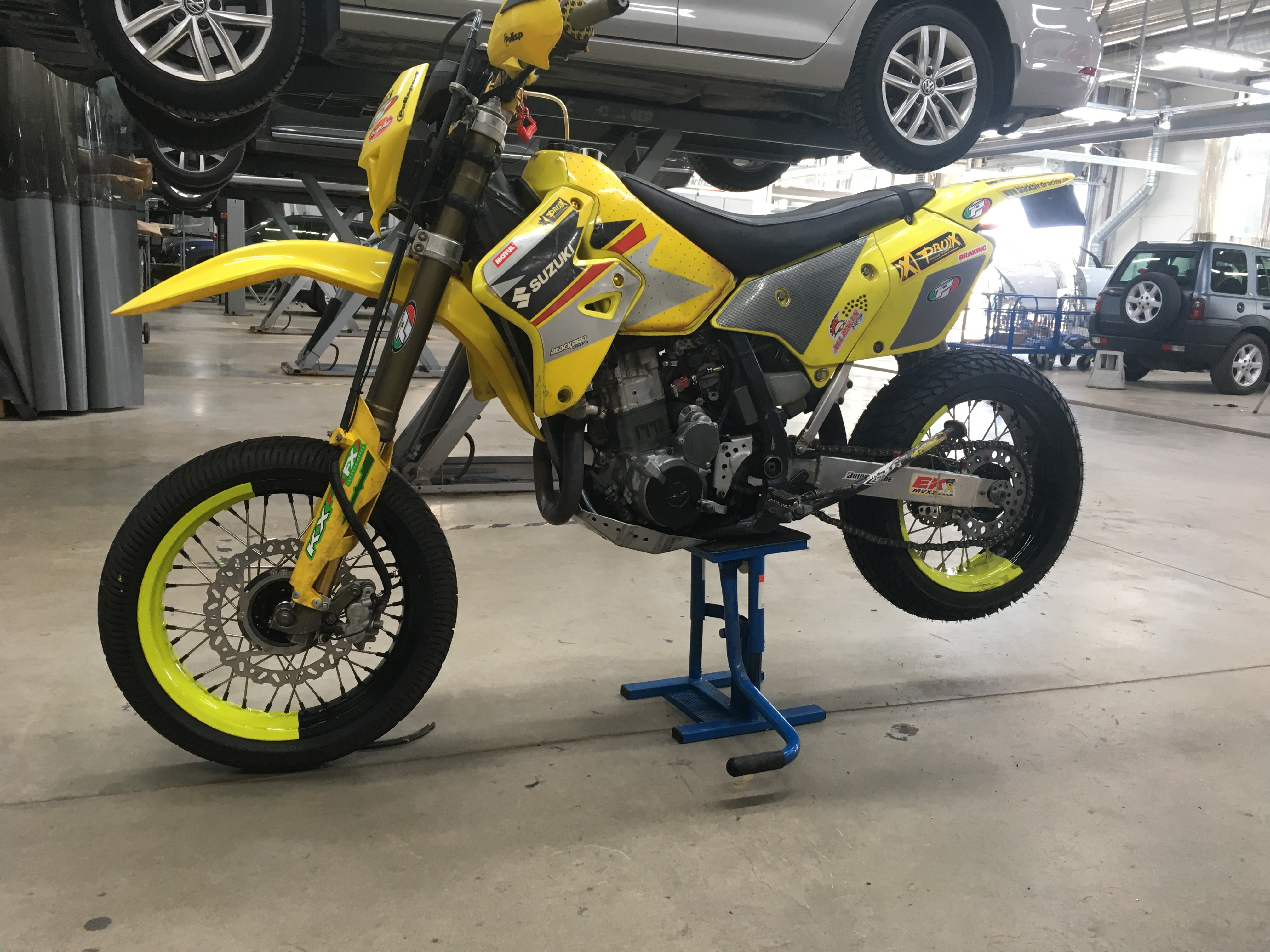 Kuna sm rattad peab alla saama, alustasin esiosast ja võtsin alt ratta, hooldasin supordi ja tegelesin selle sirtsutanud amordiga. Tolmuka võtsin eest ja puhastasin brake cleaneriga nii palju kui sai, pärast suruõhuga üle. Siis pistsin kõige õhema lehtkaliibri lehe õli simmeka vahele ja “saagisin” tiiru ettevaatlikult peale. Jääb jälgimisele… Ainult millega ei tegelenud on kiiruseandur ketta külge, tahaks seda võimalikult samale kohale kui endurorattal, a see tuleb mul veel välja mõelda kuidas. Siis pistsin alla põhjakaitsme ja suundusin tagaratta juurde, et alla proovida. Seal tuli köik algosadeks võtta, et alla mahuks. Paar koledat täket tegin ka värskele veljele selle pusimisega- life sucks.