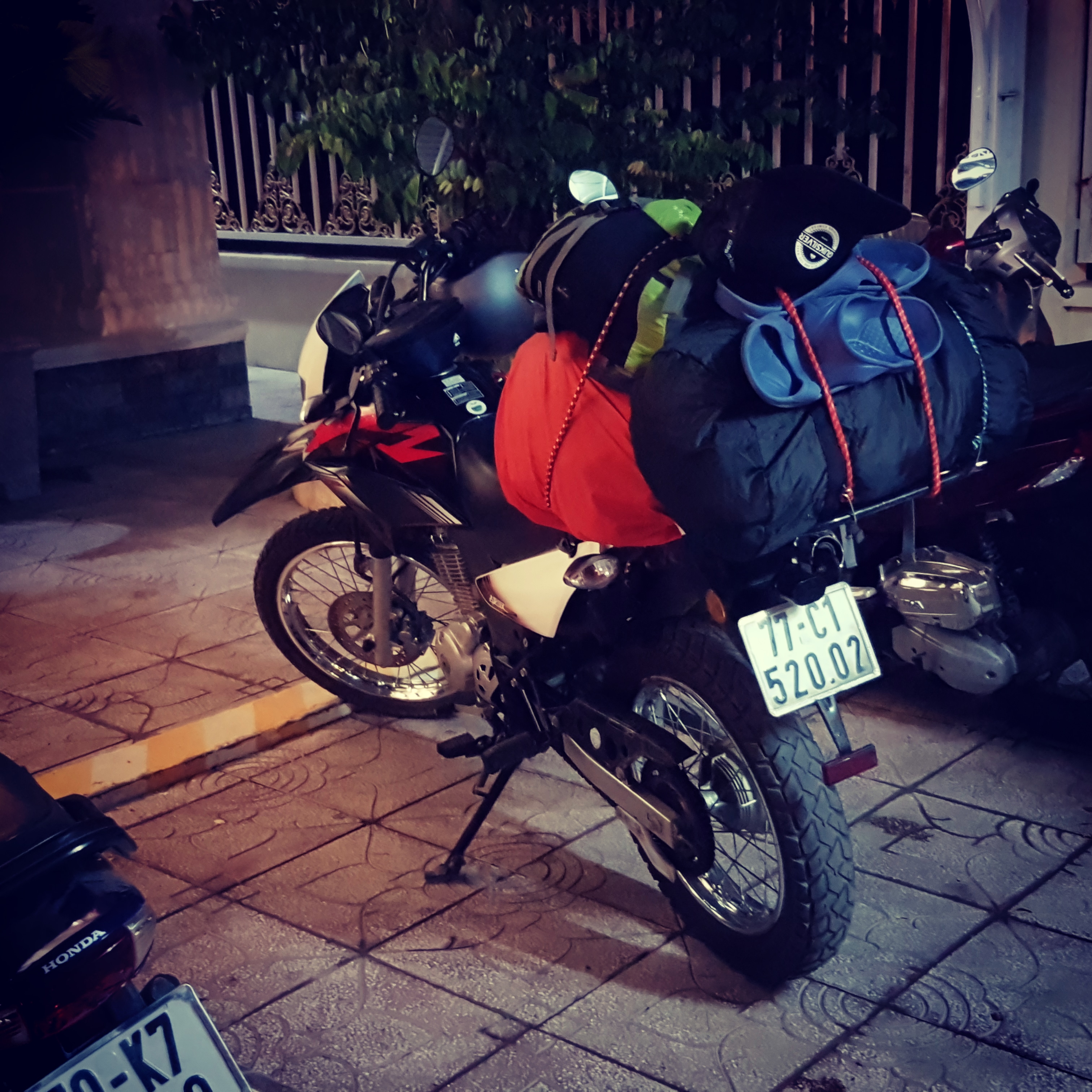 Mainisin enne, et vihma saime vähe. See üks harv kord oli aga vihm nii tugev, et ratas andis täielikult otsad. 20km enne Hoi Ani avas keegi taevaluugid. 5km sõitsime nagu läbi veeseina. Siis hakkas ratas puterdama ning jõud kadus ja suri välja. Lasin rattal natuke taastuda ning sain ta läbi häda kuidagi uuesti käima ning väga jõuetu mootoriga ka kuidagi Hoi Ani ära. Ilmselt sattus vesi kuhugi, kuhu ta sattuma poleks pidanud. Mul ei olnud aga ei teadmisi ega tööriistu, et selle ratta tervist parandada. Kirjutasin Whatsappis rendifirmasse, et selline jama. Hommikul oli uus ratas olemas ja vana ratas viidi minema. 5+ teenindus seega!! Piltide pealt on ka näha, et algne puna-must ratas asendus valgega. Teine ratas oli juba üsna eakas. 2a vana ja 29 000 km, aga töötas nagu kell. Nad ütlesid, et nad hoiavadki rattaid kuni 2 a või 30 000 km. Seega oli see kasutusperioodi lõpus. Kütust võttis xr150 ülivähe. 2.2-3.0 l /100km. Enduro on hea valik Vietnamis. Otsest vajadust pole, aga avab võimalusi keerata sinna kuhu muidu ei keeraks ja kasutasime seda võimalust üsna ohtralt. Navigeerimise ja ka muu elu tarbeks sai võetud kohalik sim kaart (8 eur kuu aega piiramatu 4G internet).