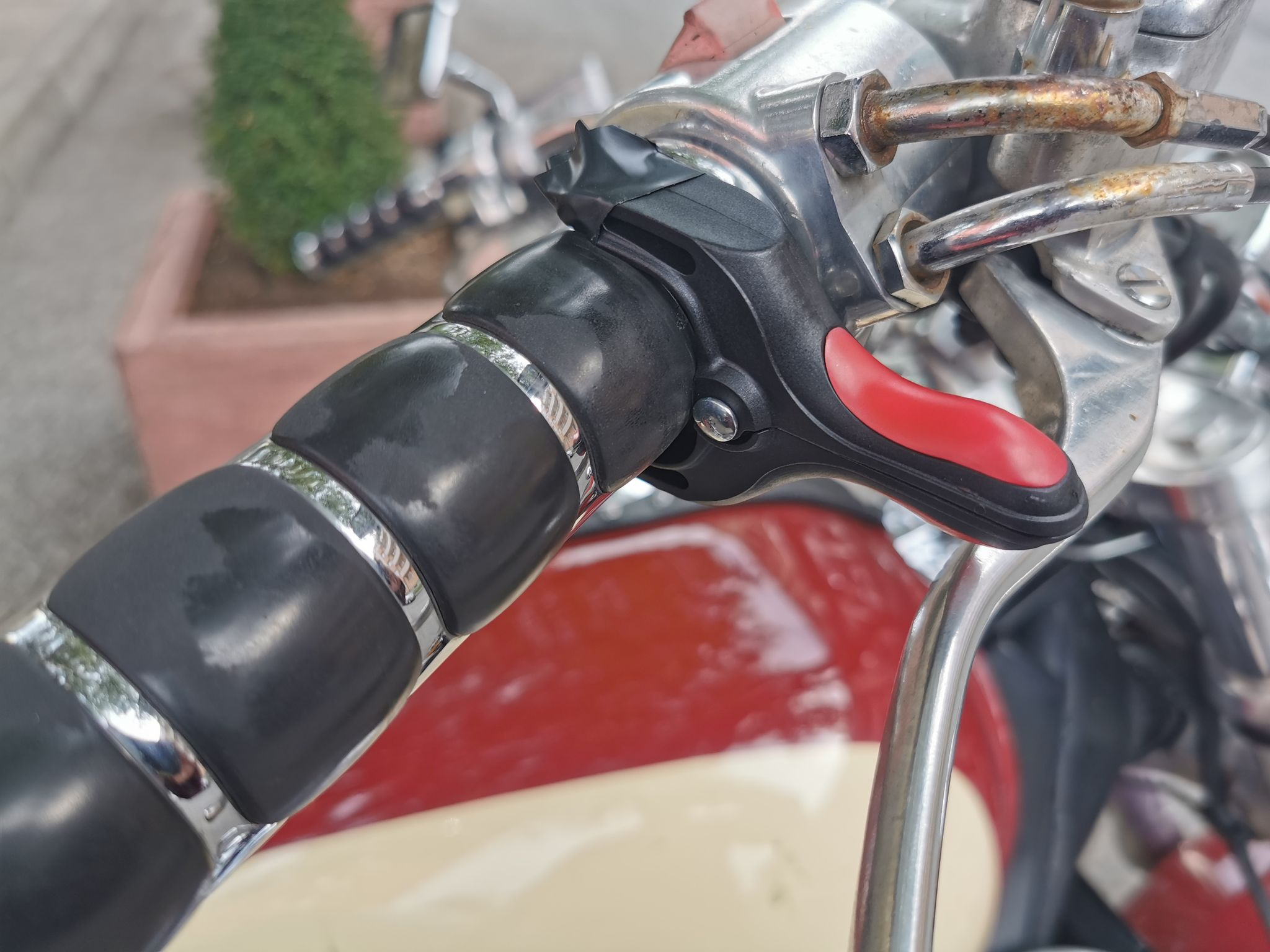 Minu jaoks väga heal ajal muutus teema aktiivseks, kuna pikemat maanteesõitu õige pea ees. Läksin ka sellist teed, nagu @Macintosh näitas. Kuna minul on osaliselt kroomitud kattega gaasirull ning sel osal, kus klamber segamata istuda saab, kummi pole, siis tuli pidamist veidi elektriteibiga järele aidata ja nii toimib kenasti. Kui juba lenksule asetatud, siis on ühe käega nii lihtsalt opereeritav, et teoorias kannataks ka Tallinna pikemaid tänavaid sellega sõita, aga see ei ole muidugi eesmärk.