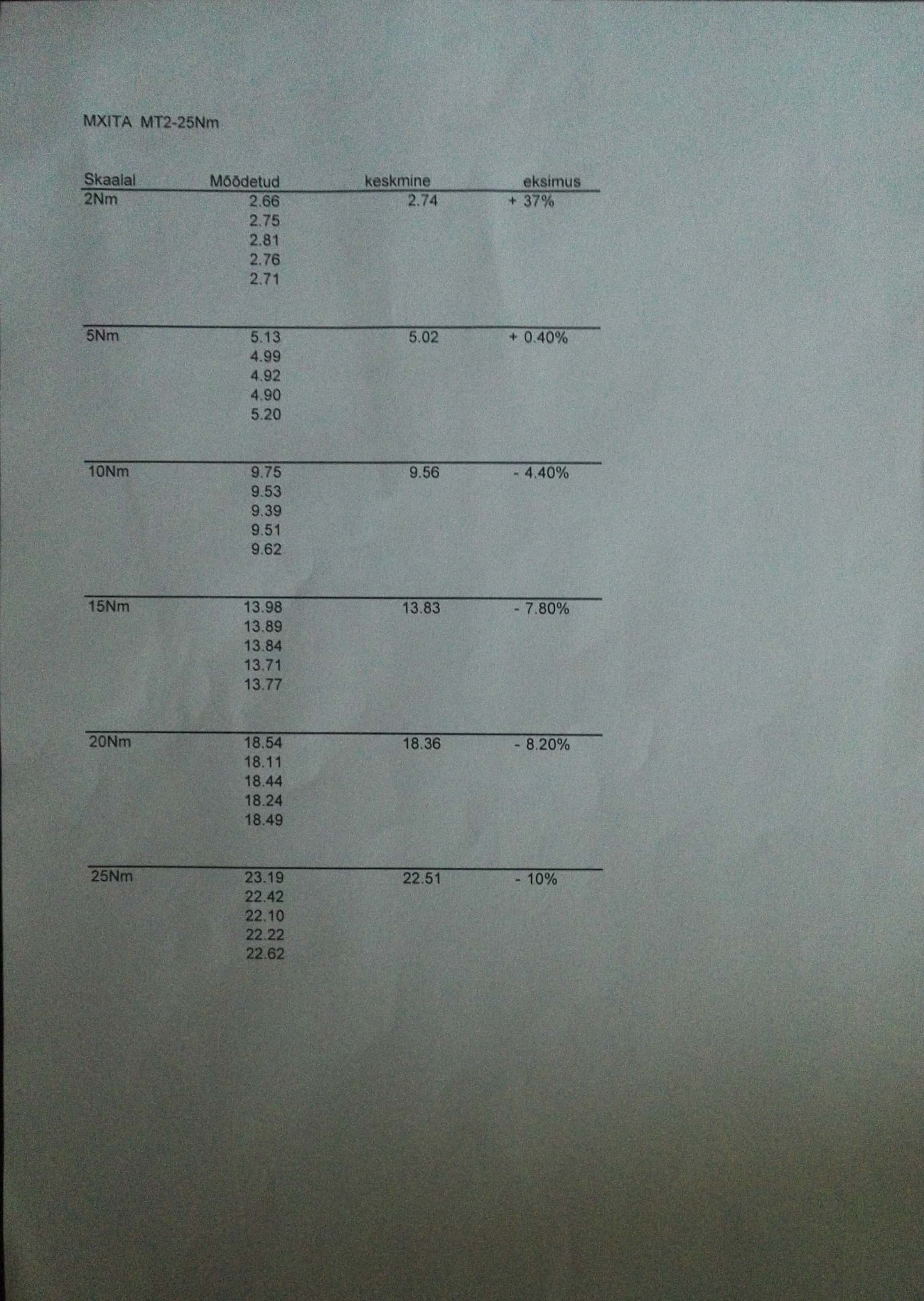Ametlik vahemik 5-25. Kalibreerija proovis ka 2Nm, mis oli ka võimalik aga suure eksimusega ![]()