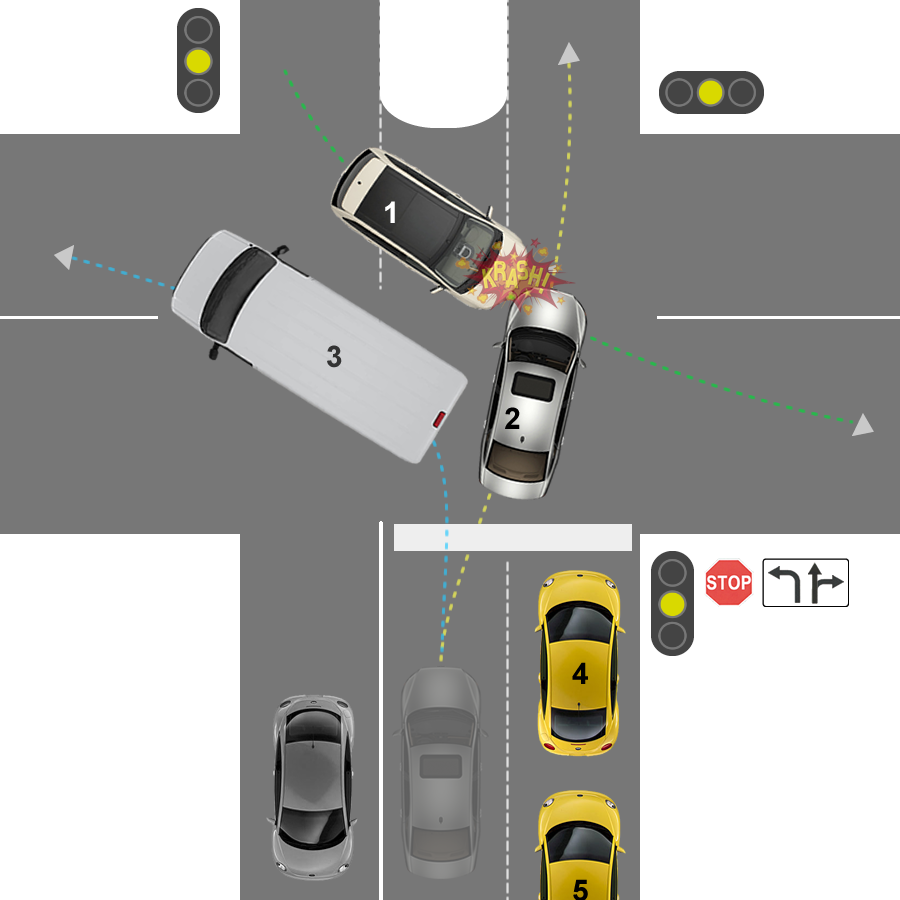 Liiklemist ristmikul regileerivad liiklusmärk "sõidurajad ja suunad" ning valgusfoor. Fooris põleb kollane tuli. Sõidukid 4 ja 5 on peatunud ja ootavad rohelist tuld. Samaegselt on ristmikule on välja sõitnud vasakpööret sooritama sõidukid 1 ja 3 (kaubik). Vasakpööret sooritava sõiduki 3 tagant kimab viimasel hetklel (vilkuva rohelisega?) ristmikule sõiduk 2 ja põrutab otsa sõidukile 1. Kes on süüdi kas sõiduk 1 või sõiduk 2?